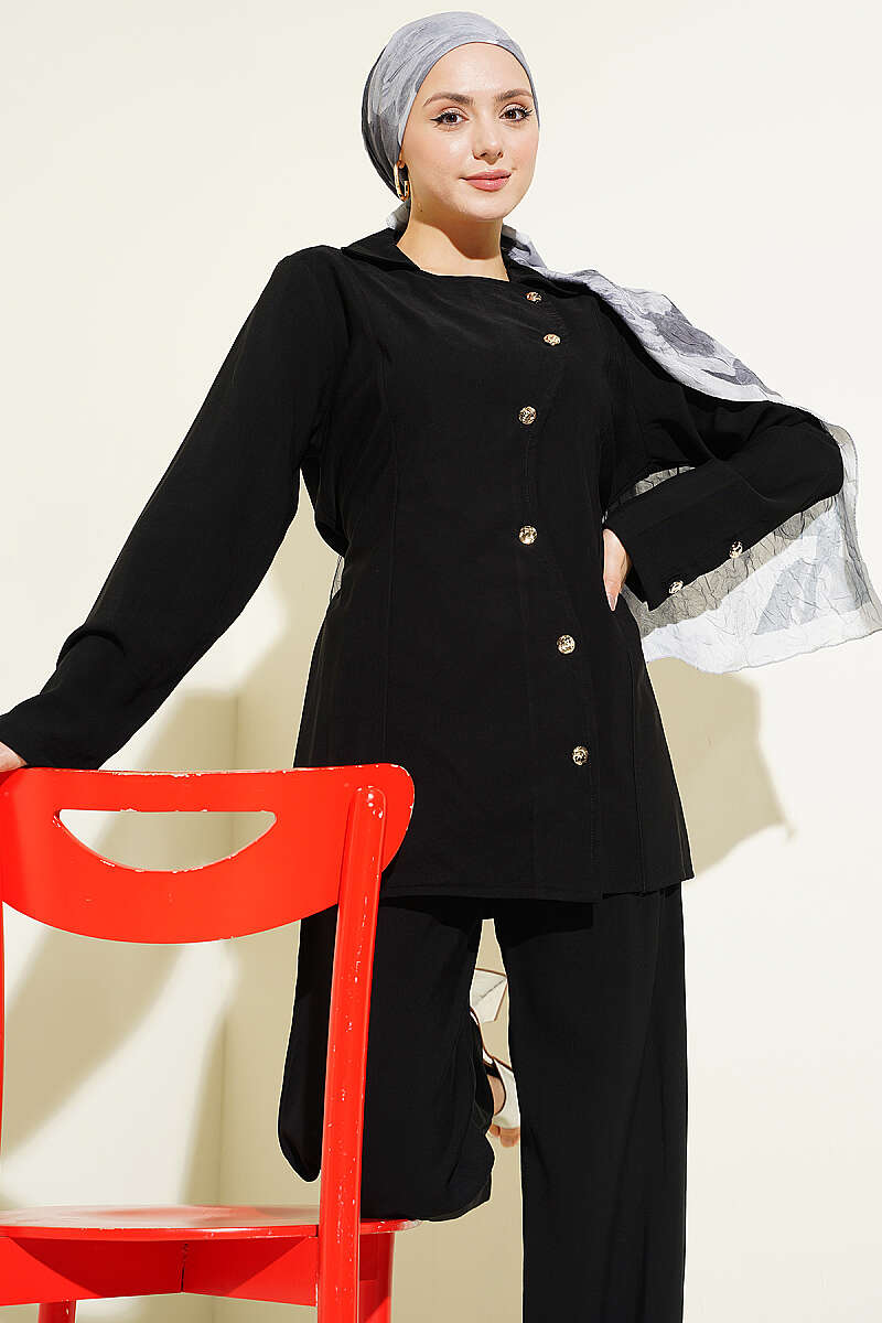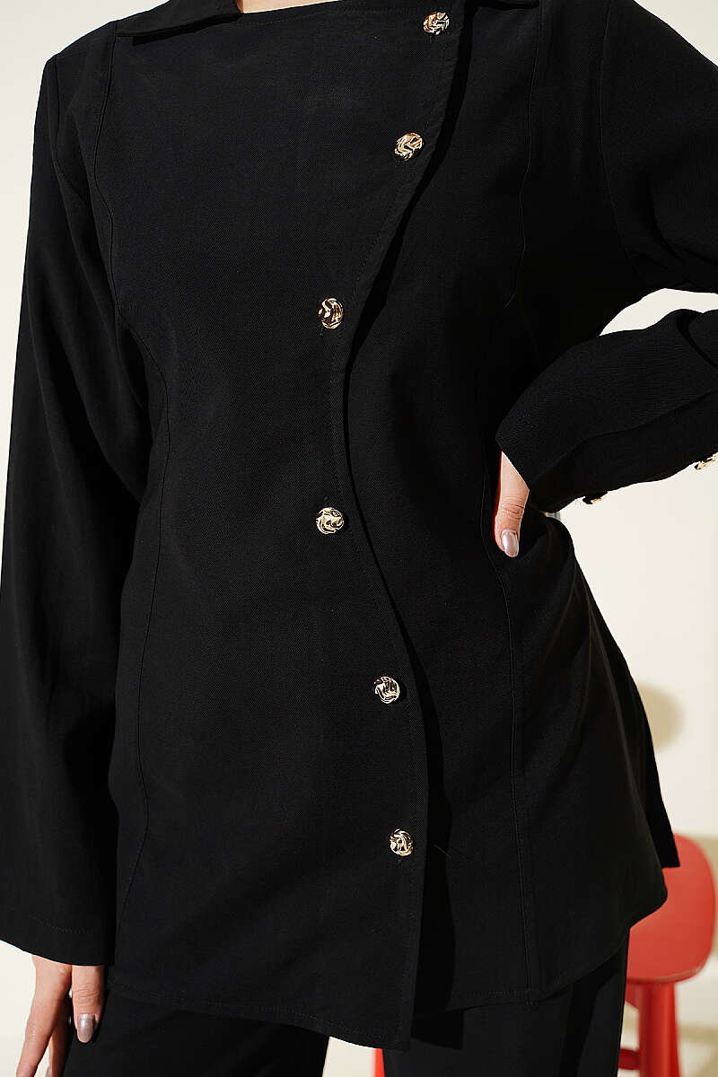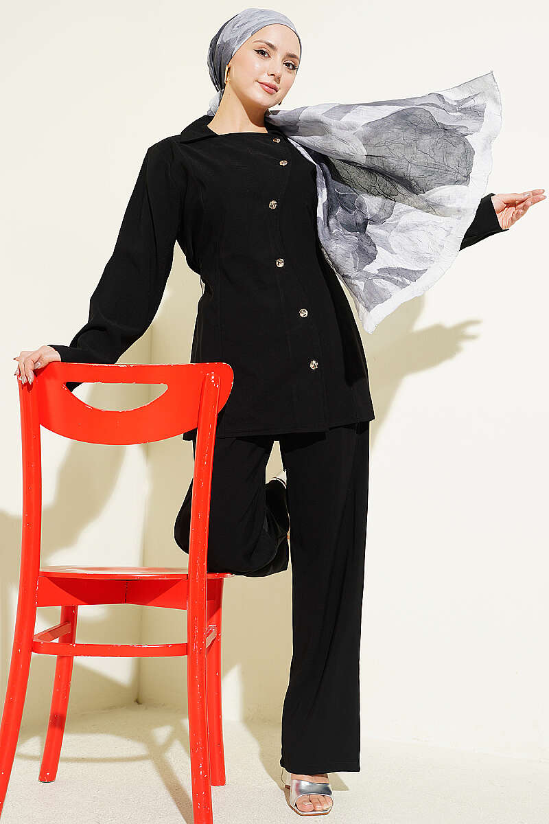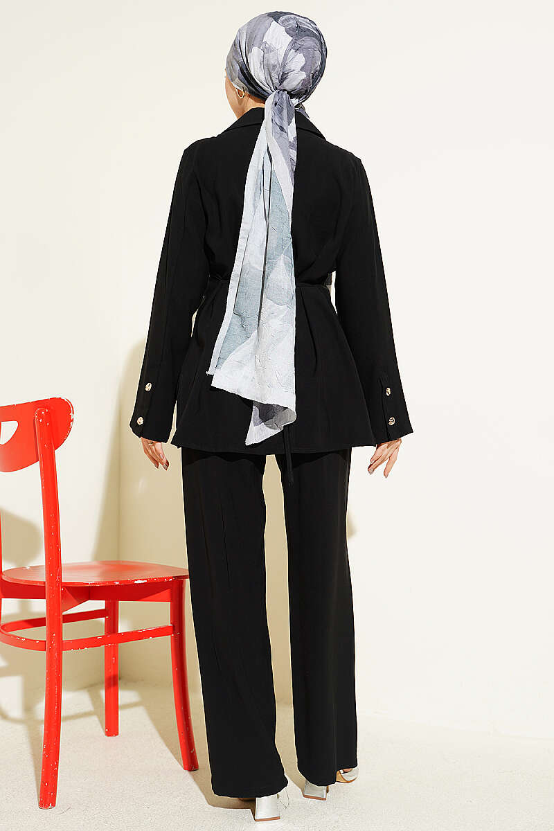 Asimetrik Düğmeli İpli Tensel İkili Takım Siyah