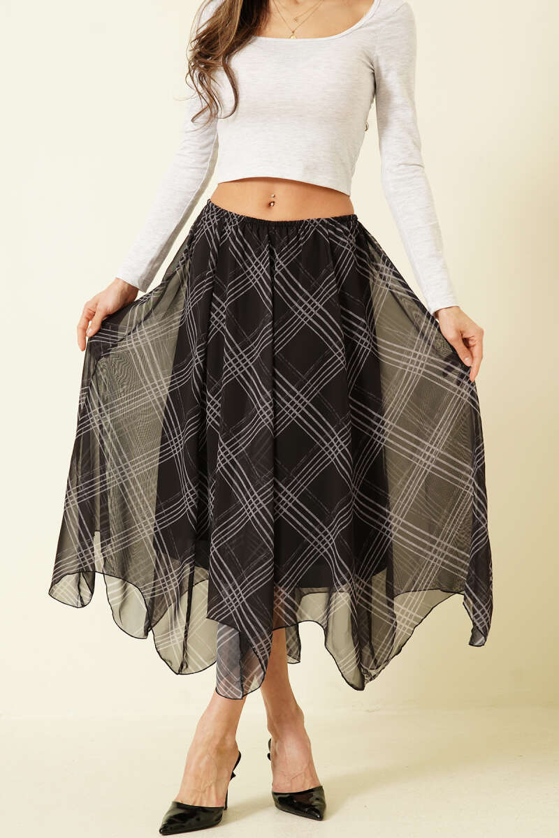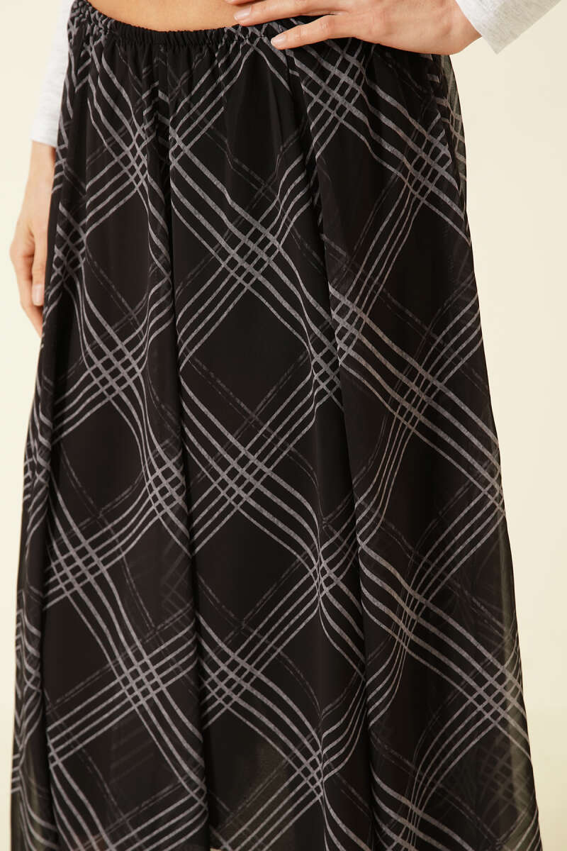 Asimetrik Ekoseli Beli Lastikli Midi Etek Siyah