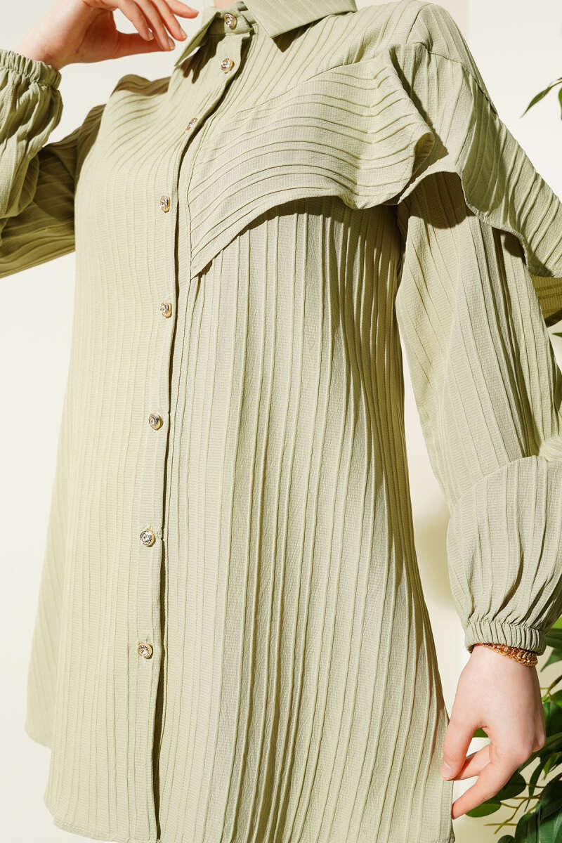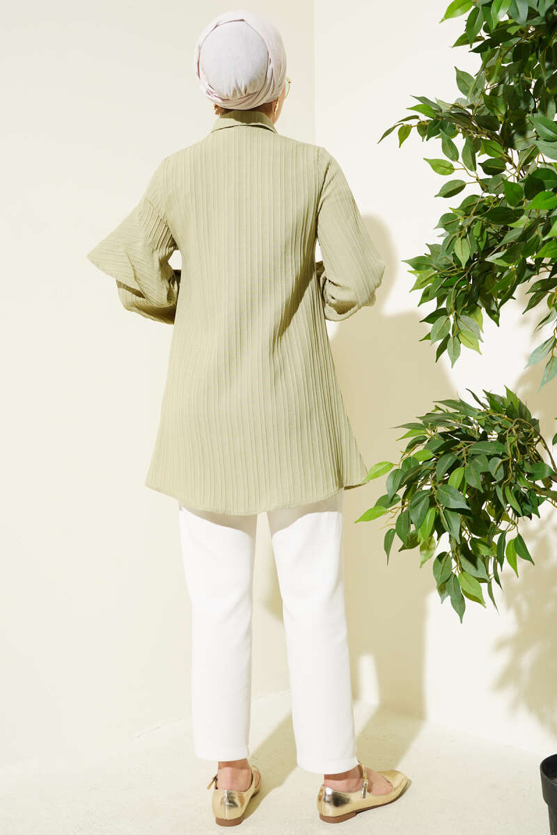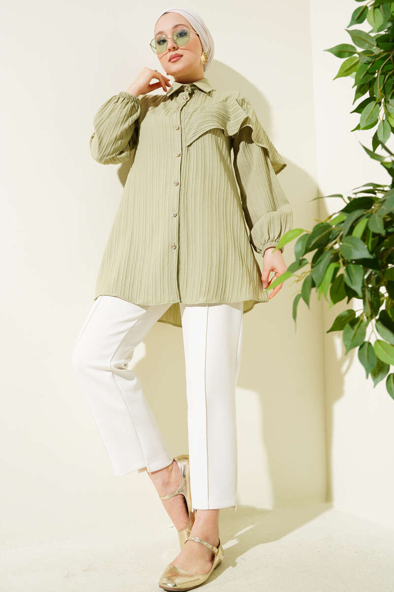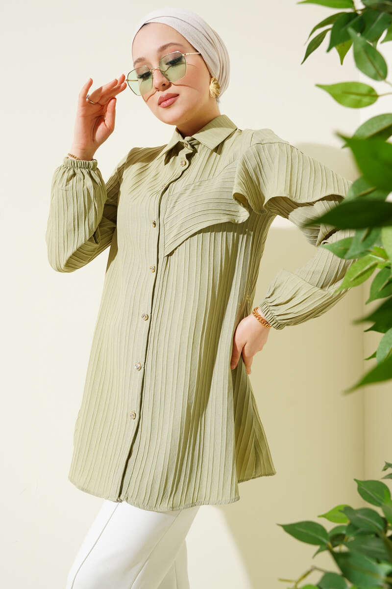 Asimetrik Fırfırlı Kabartma Çizgili Gömlek Çağla Yeşili