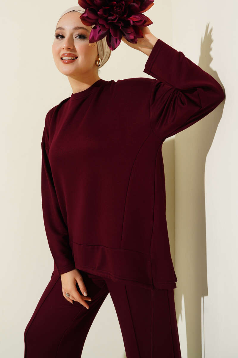 Yaka Fermuarlı Garnili İkili Takım Bordo
