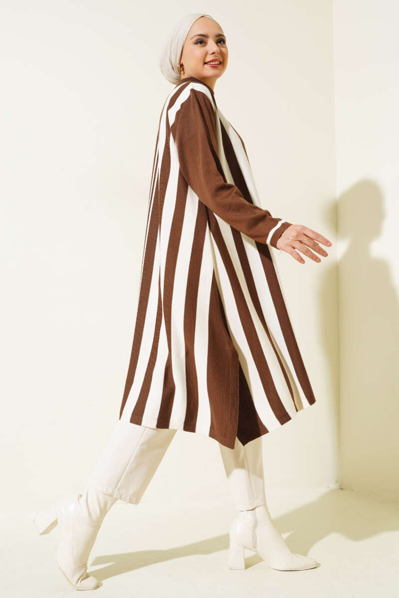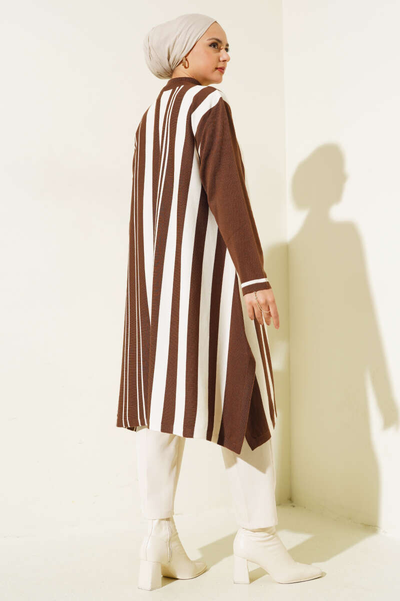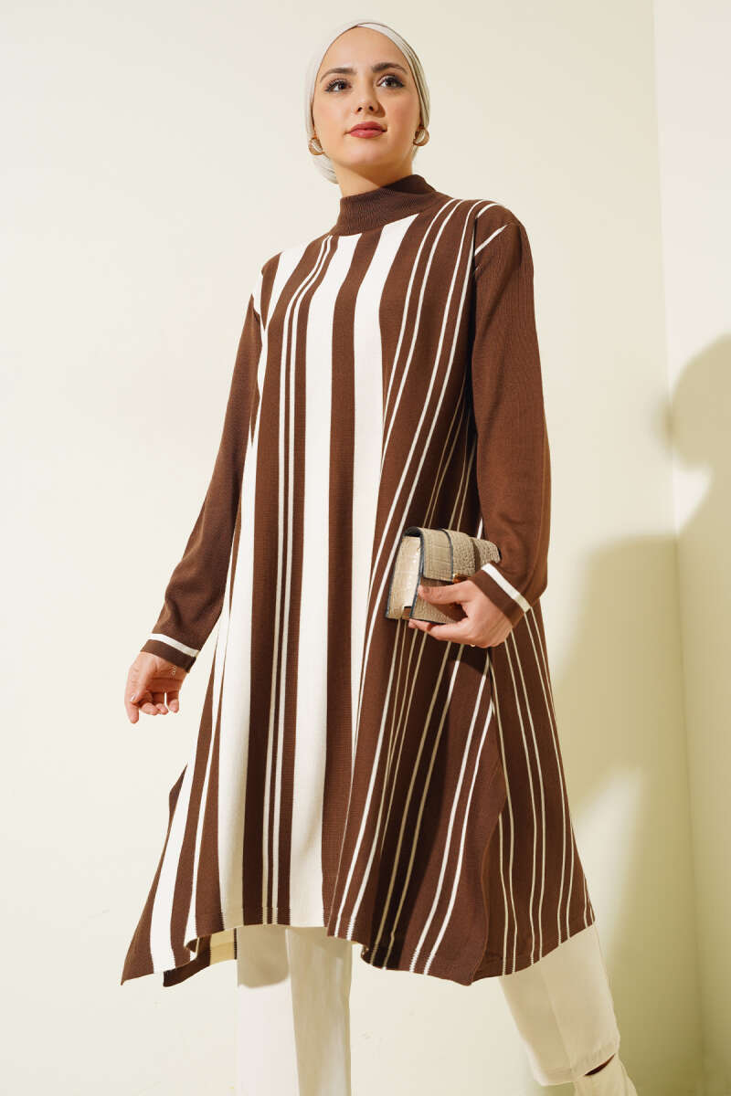Yatay Çizgili Balon Kol Triko Tunik Kahve
