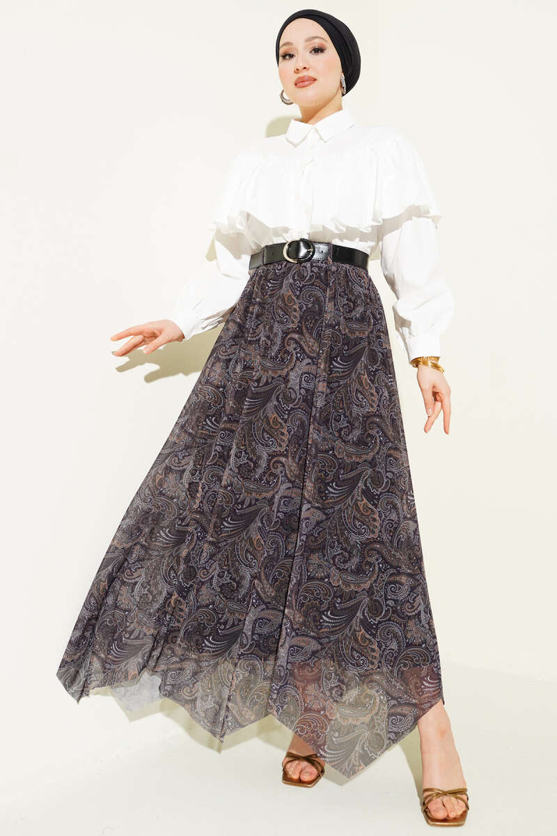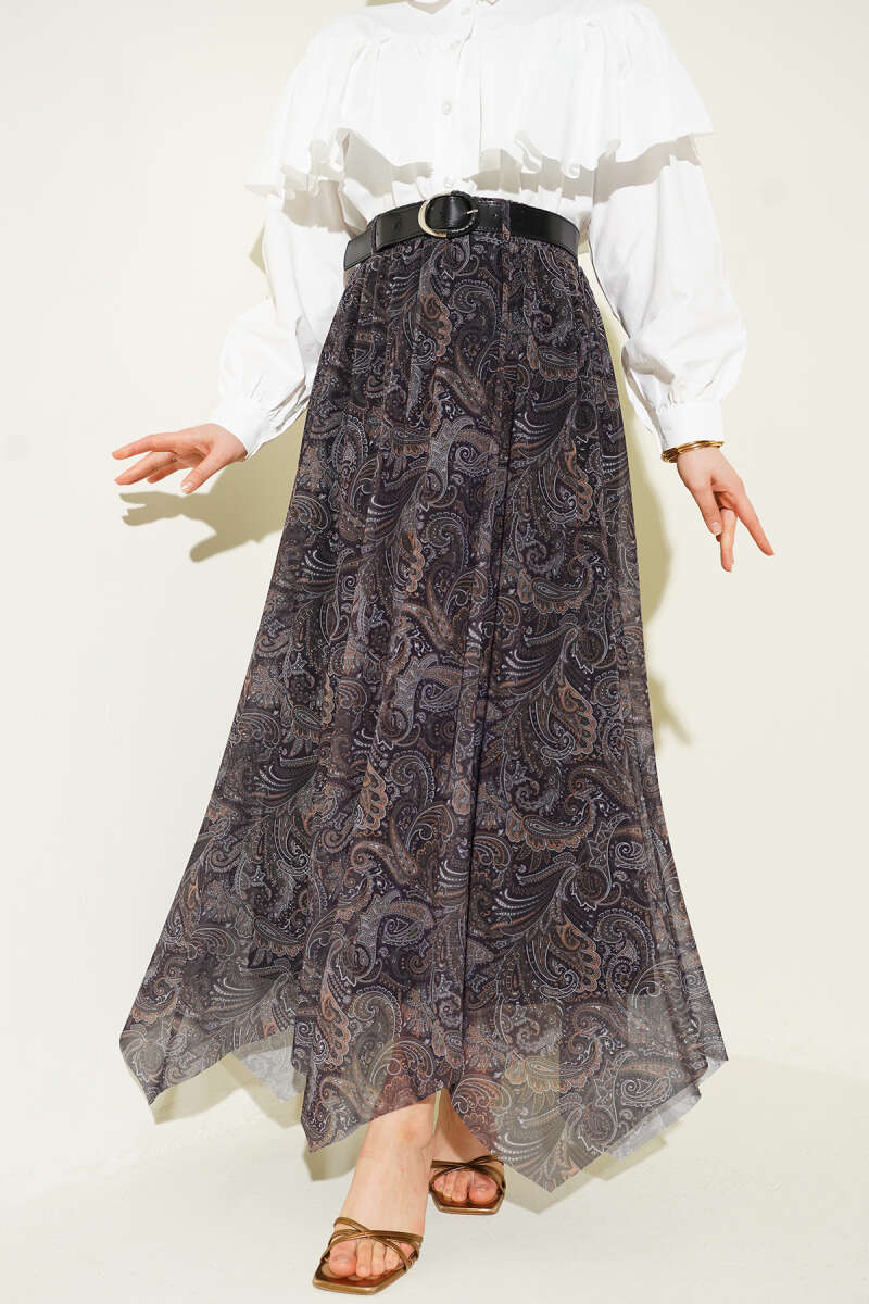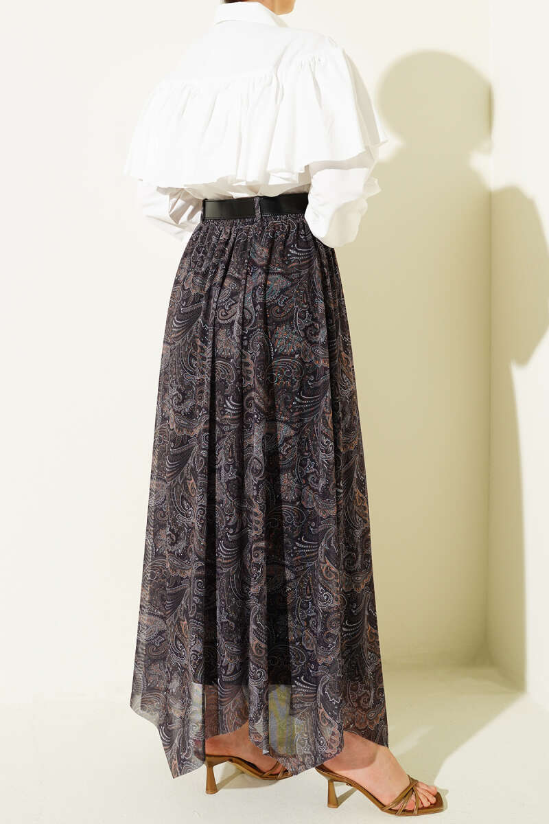Asimetrik Kesim Etnik Desen Etek Haki