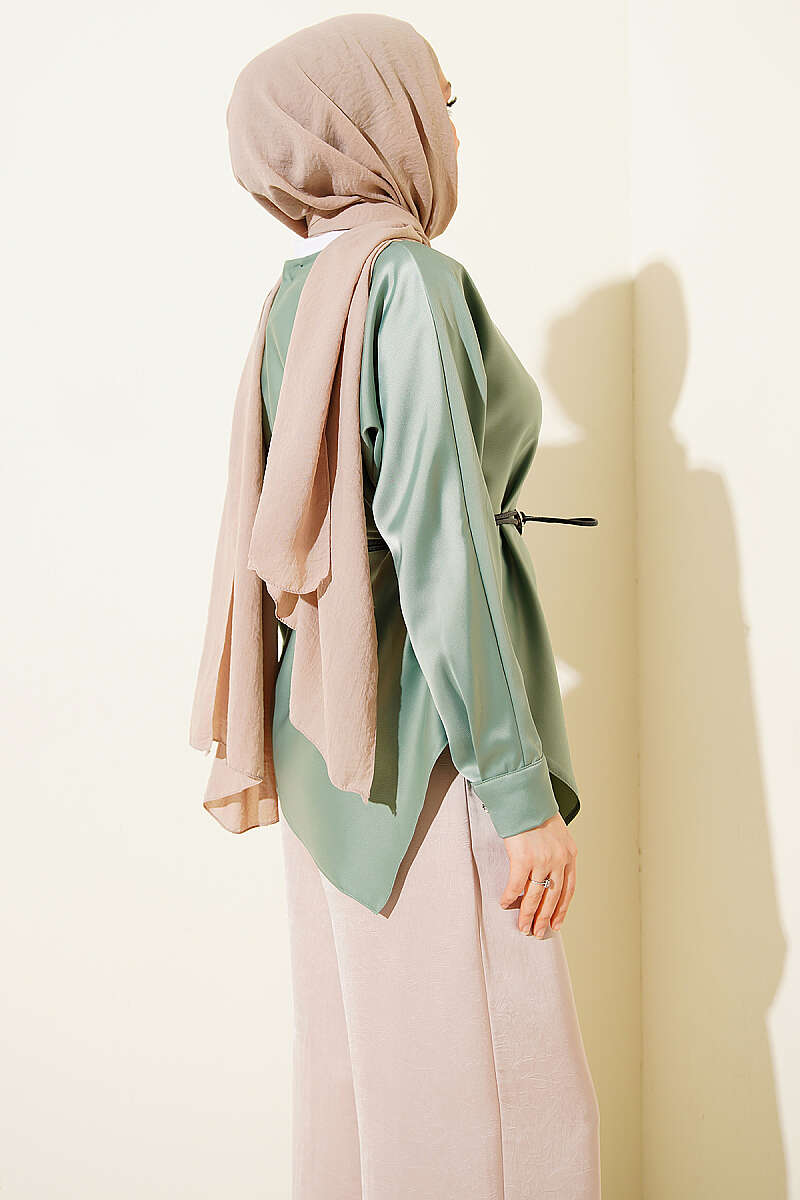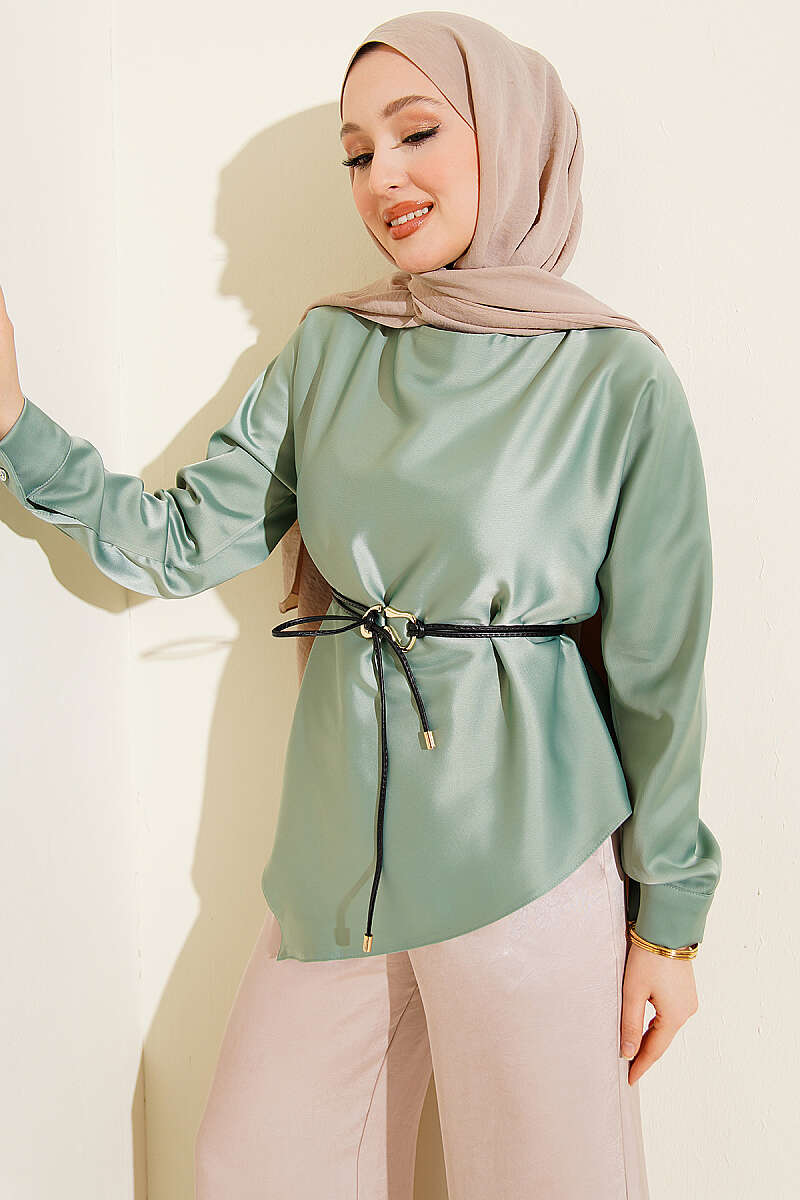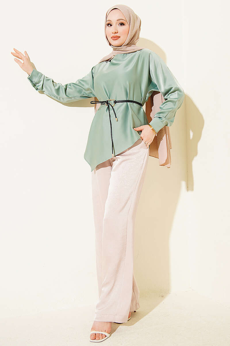 Asimetrik Kesim Saten Tunik Çağla Yeşili
