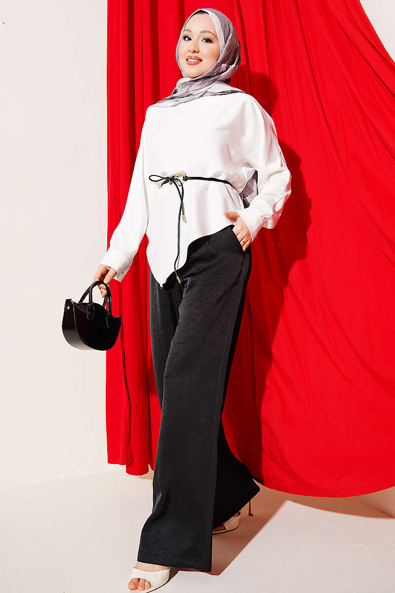 Asimetrik Kesim Saten Tunik Ekru