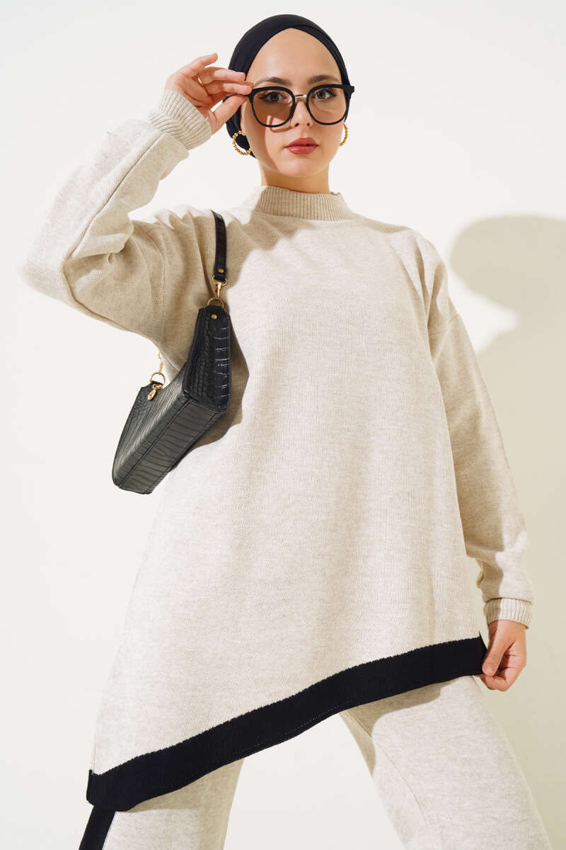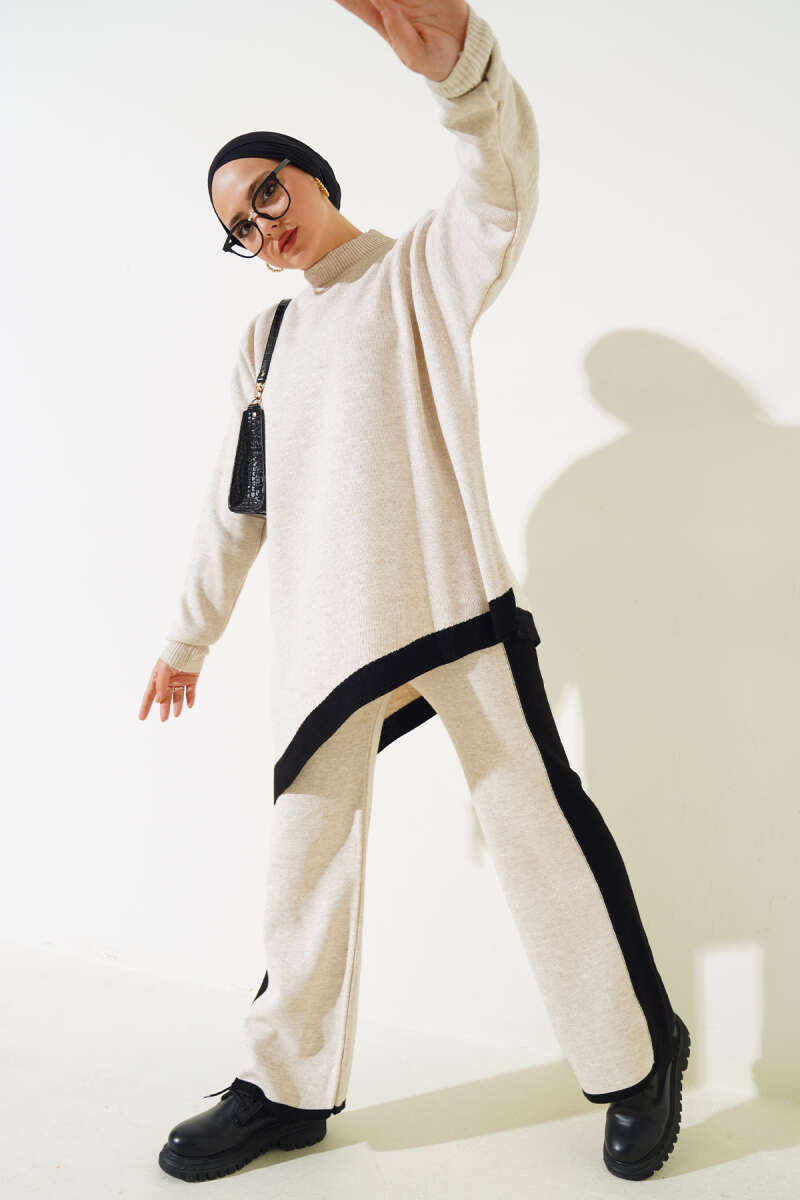 Taşlı Baklava Desen Triko İkili Takım Bej