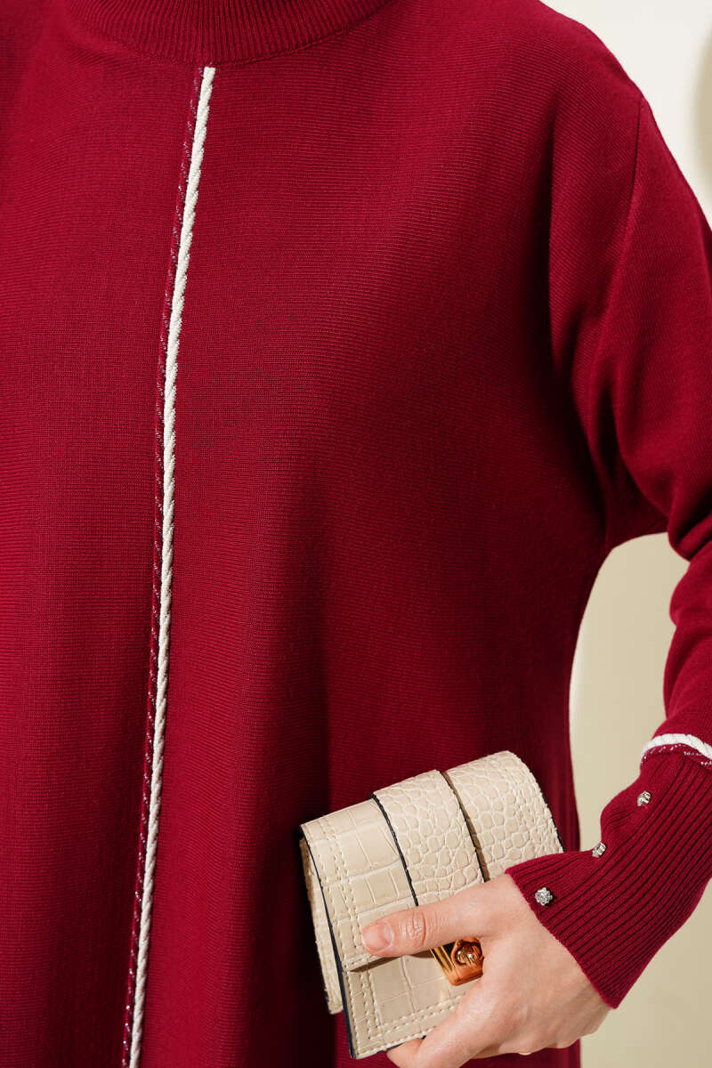 Yatay Çizgili Düşük Omuz Triko Tunik Bordo