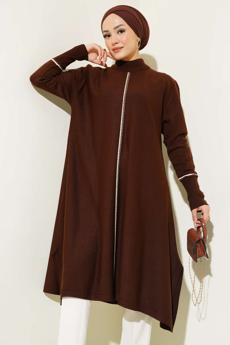 Yaka Fularlı Yumoş Triko Tunik Kahve