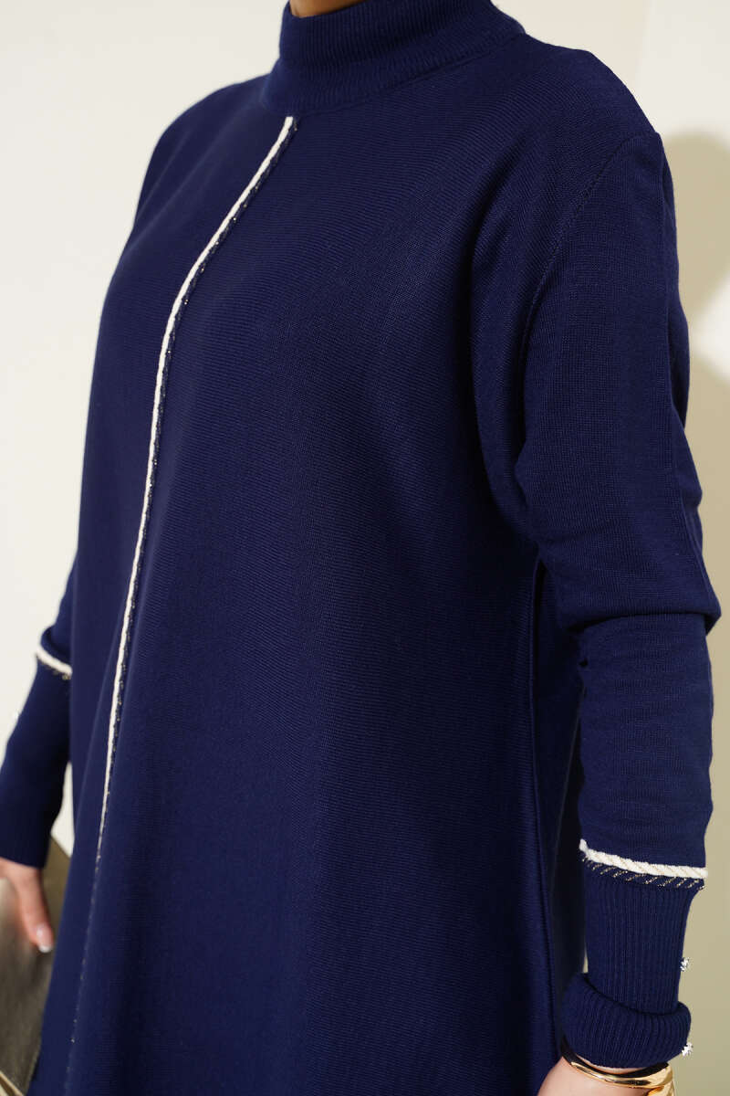 Yatay Çizgili Düşük Omuz Triko Tunik Lacivert