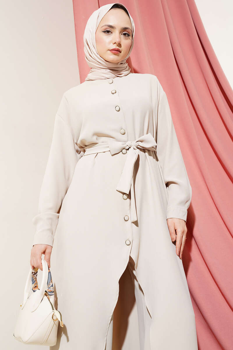 Asimetrik Kesim Uzun Tunik İkili Takım Bej