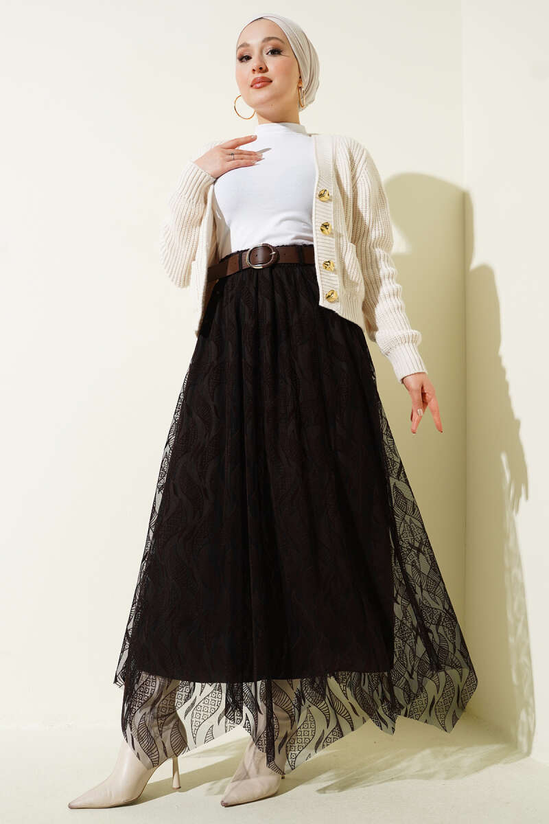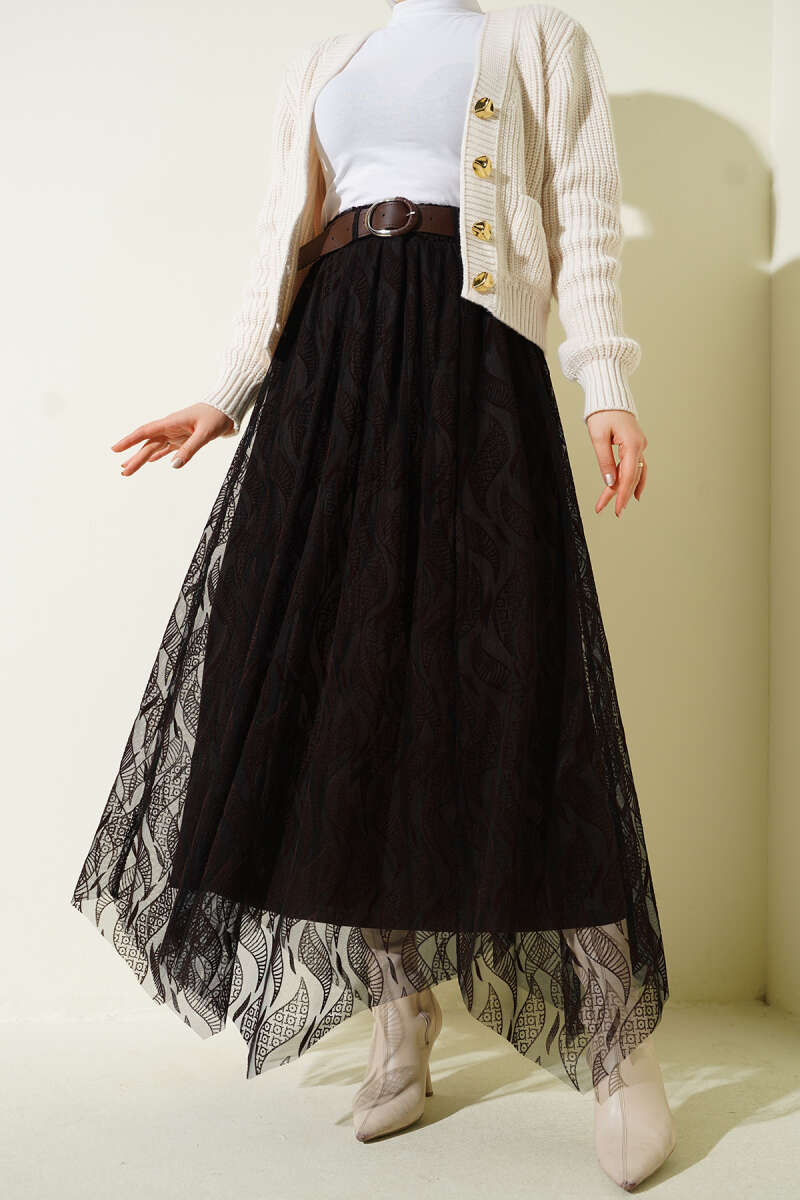 Asimetrik Tüllü Kemerli Etek Siyah