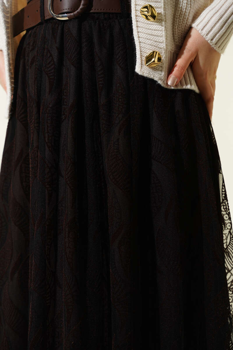 Desenli Pileli Beli Lastikli Etek Kahve
