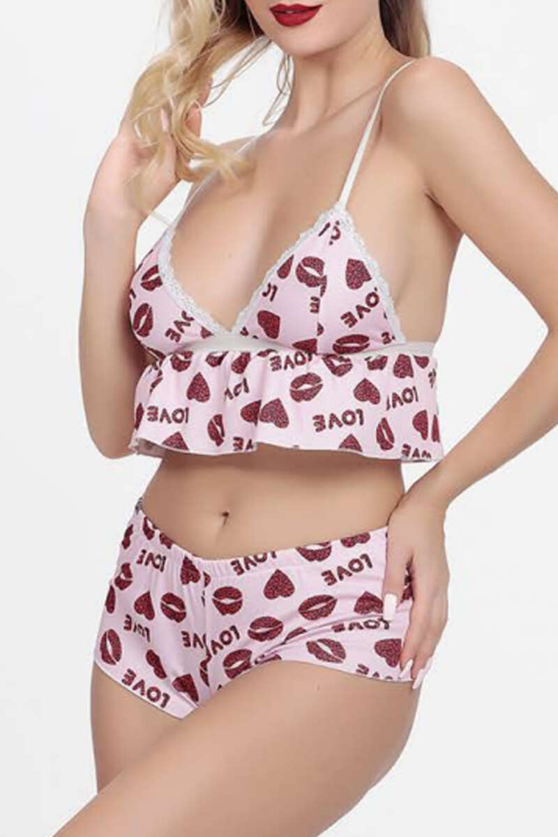Askılı Dantel Detaylı Baskılı Gecelik Pembe