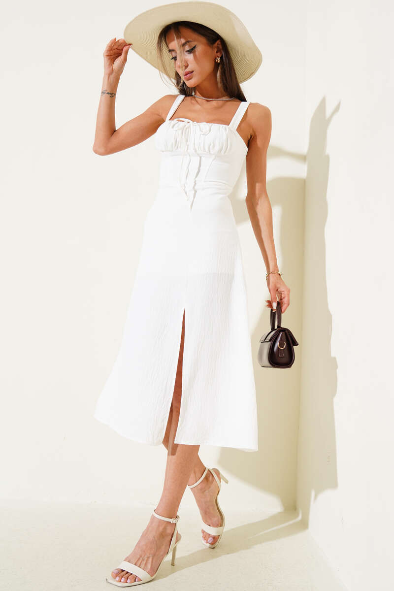 Önü Yarım Düğmeli Kat Kat Elbise Kahve