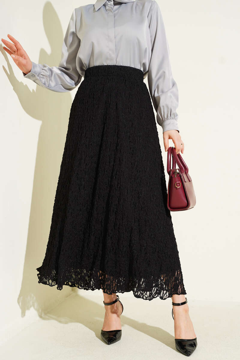 Çizgili Bel Lastikli Şifon Etek Siyah Mavi