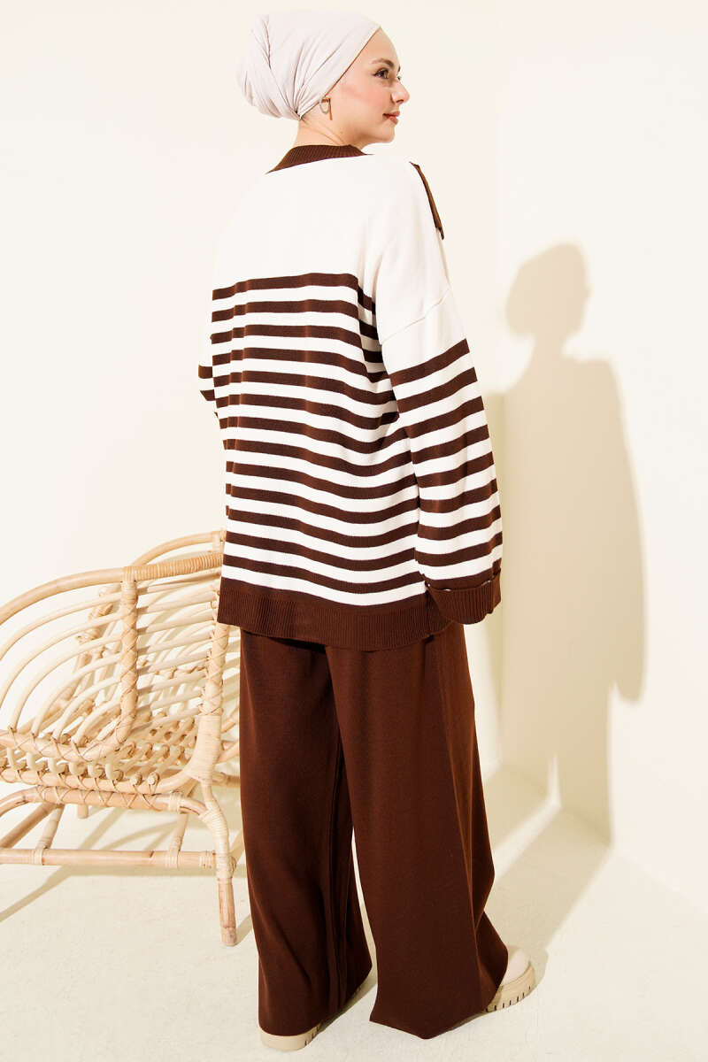 Düğmeli Şeritli Hırkalı Triko İkili Takım Bej