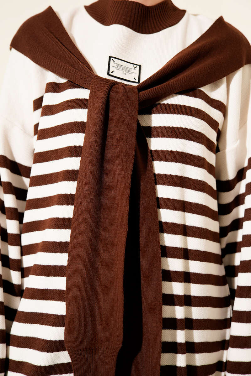 Atkı Detaylı Çizgili Triko İkili Takım Bordo