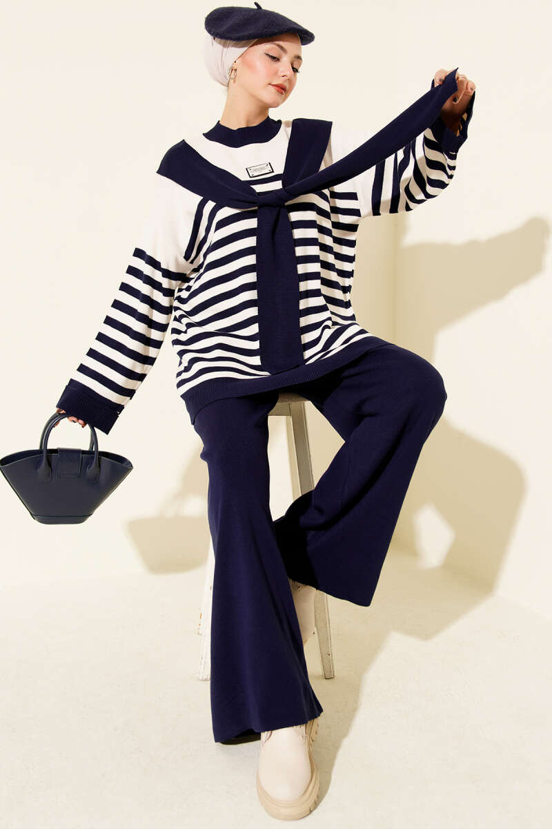 Atkı Detaylı Çizgili Triko İkili Takım Siyah