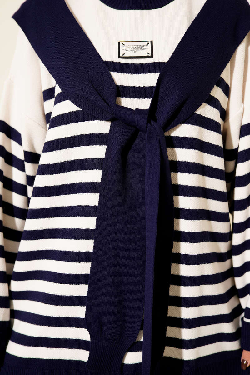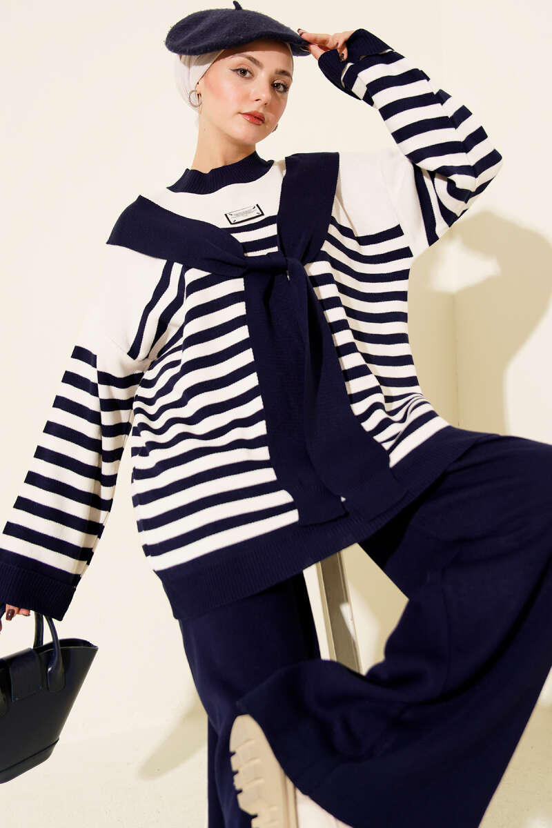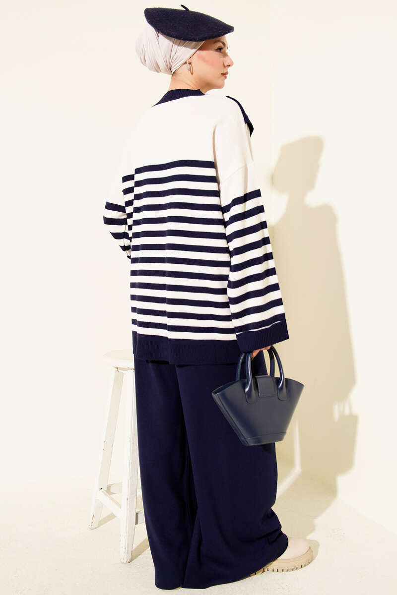 Düğmeli Şeritli Hırkalı Triko İkili Takım Lacivert