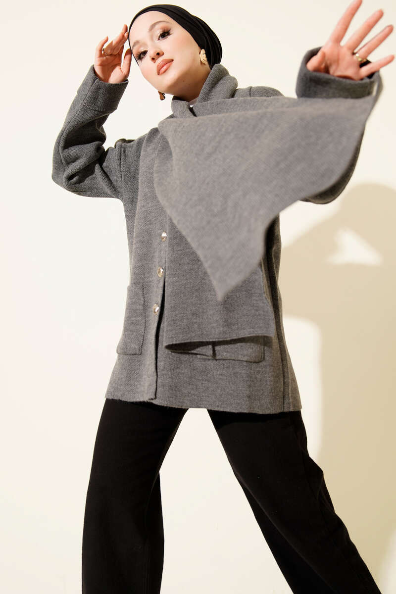 Atkılı Düğmeli Cepli Triko Hırka Füme