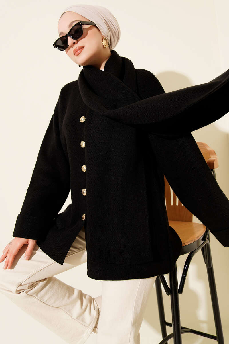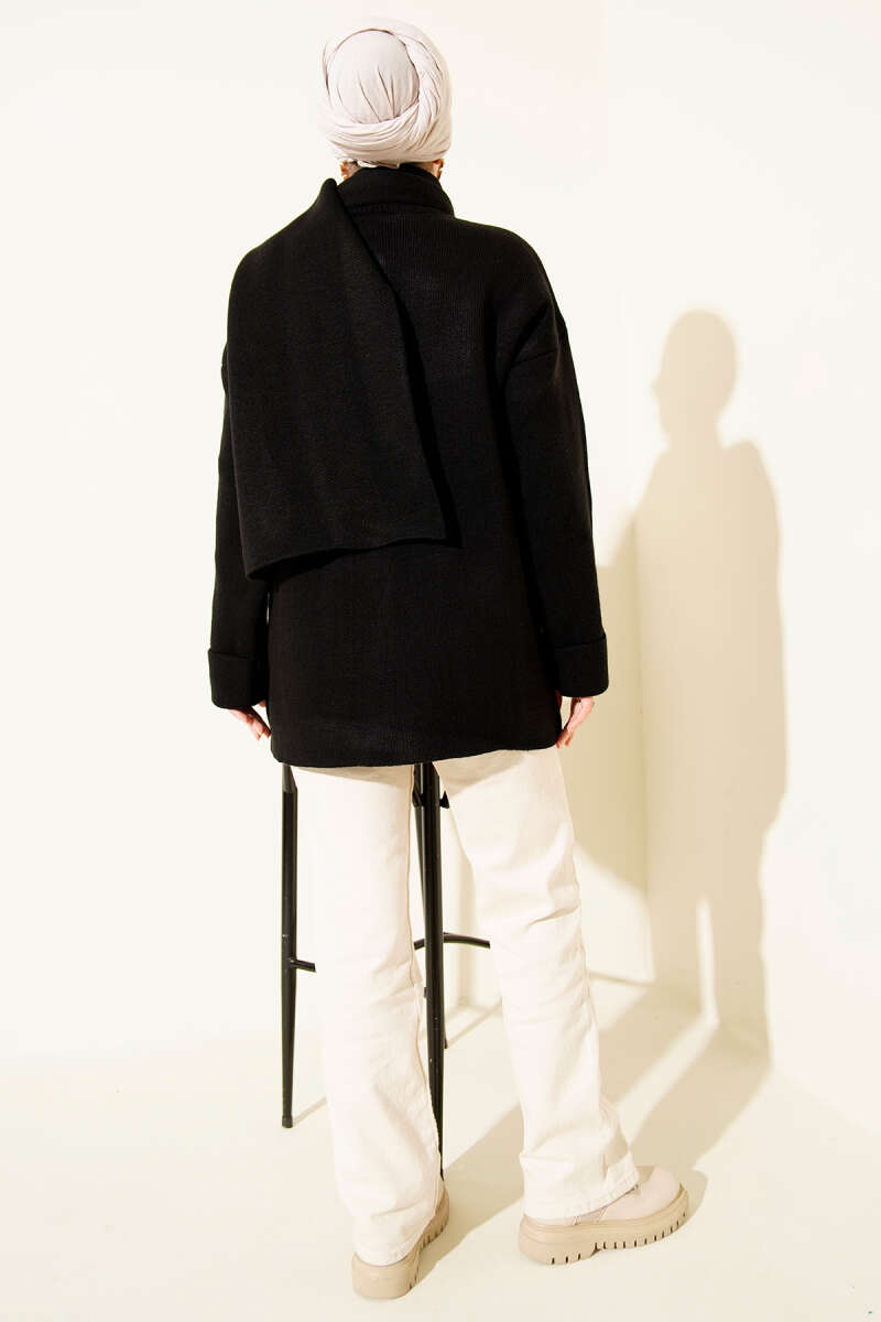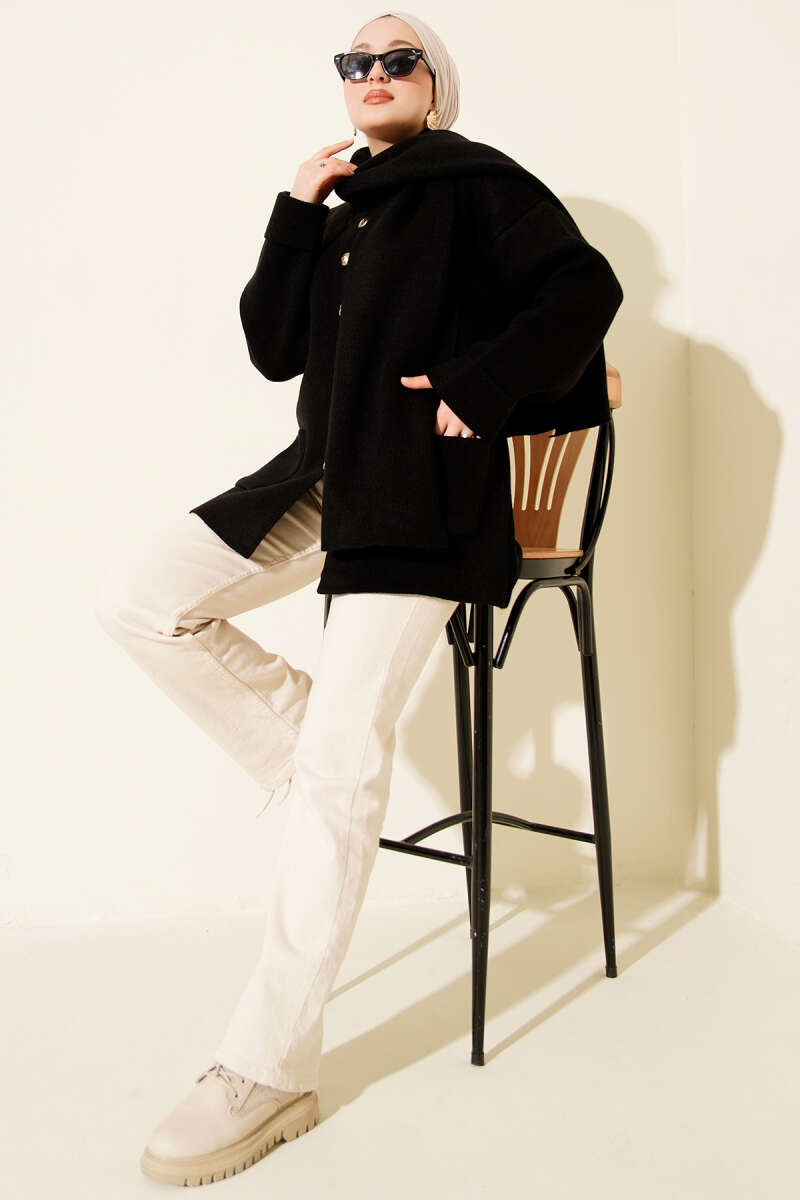 Gömlek Yaka Düğmeli Kaşe Panço Siyah