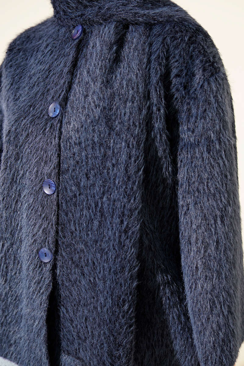 Düğmeli Kuşaklı Tay Tüyü Ceket Lacivert