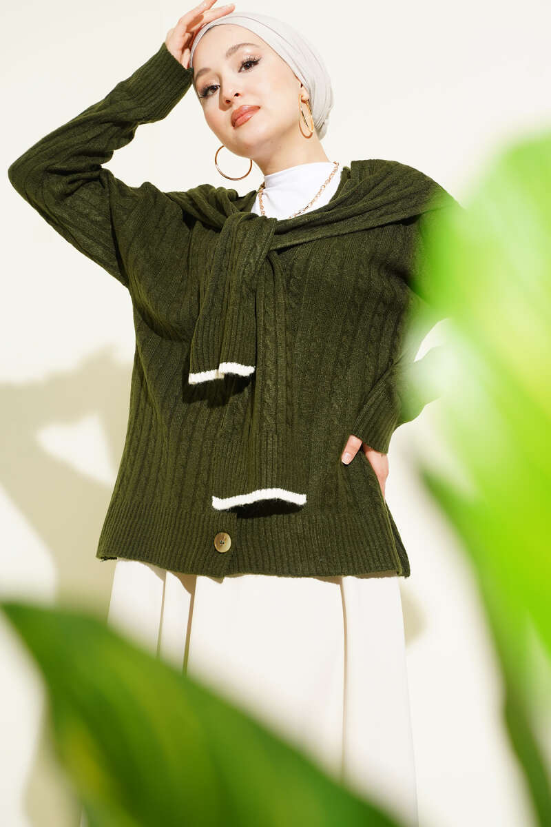 Atkılı Örgülü Kısa Triko Hırka Haki