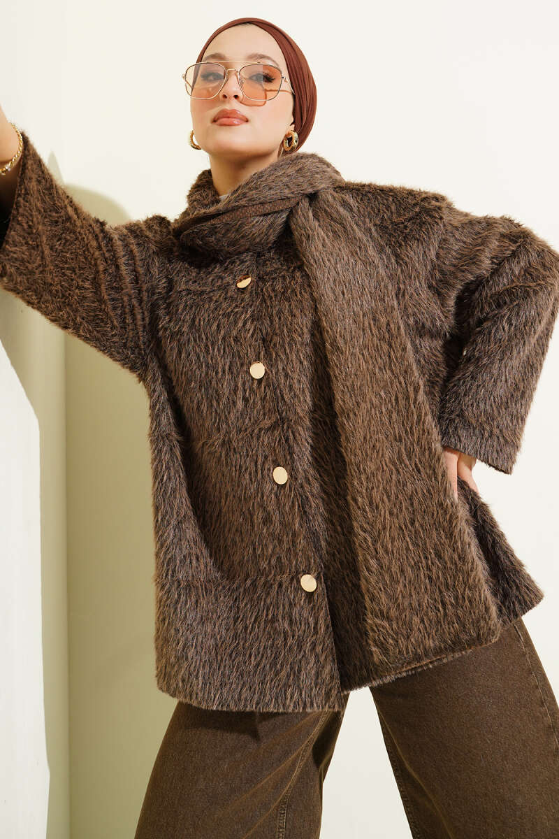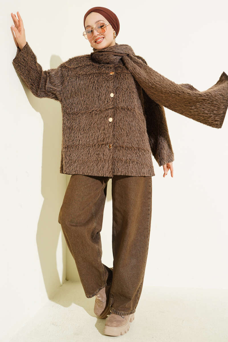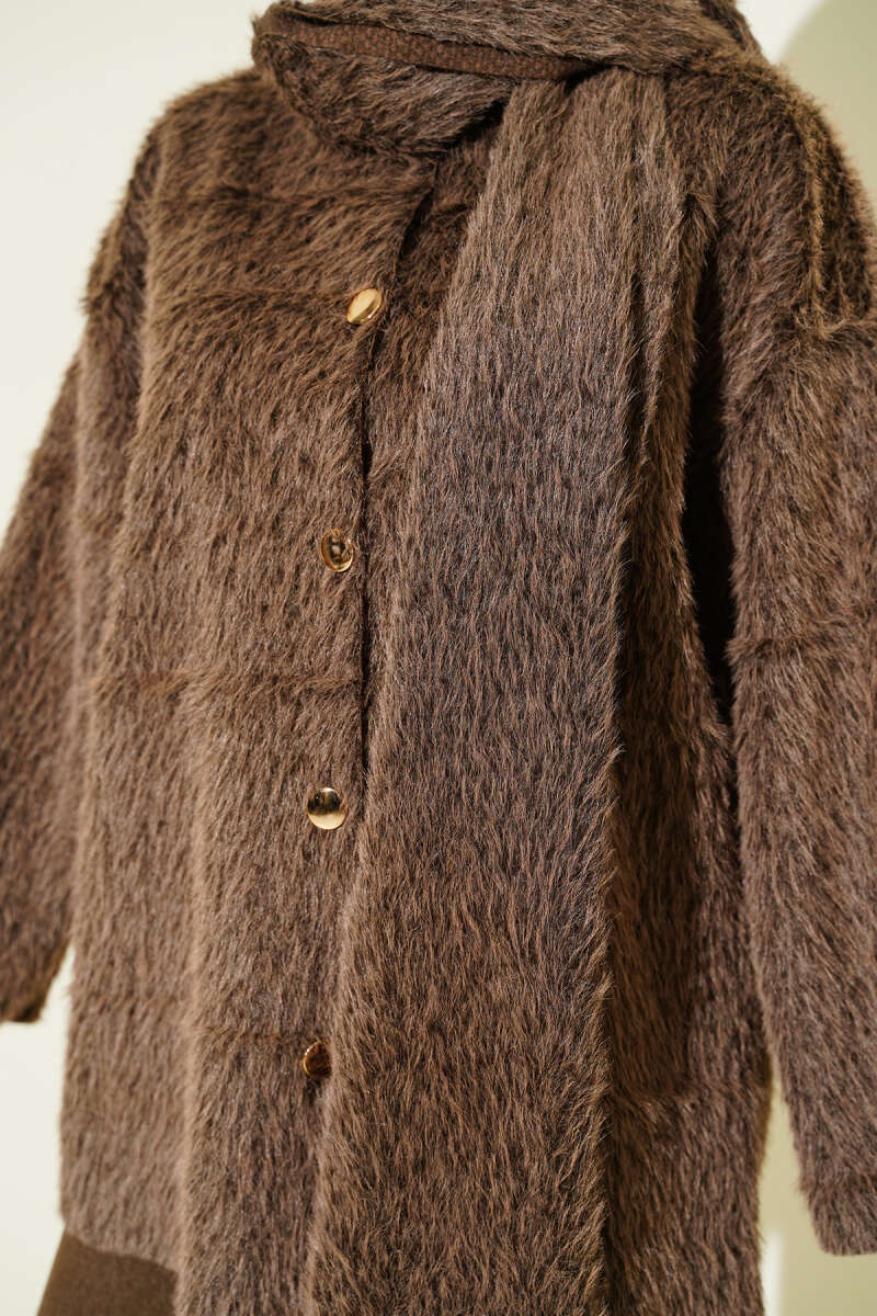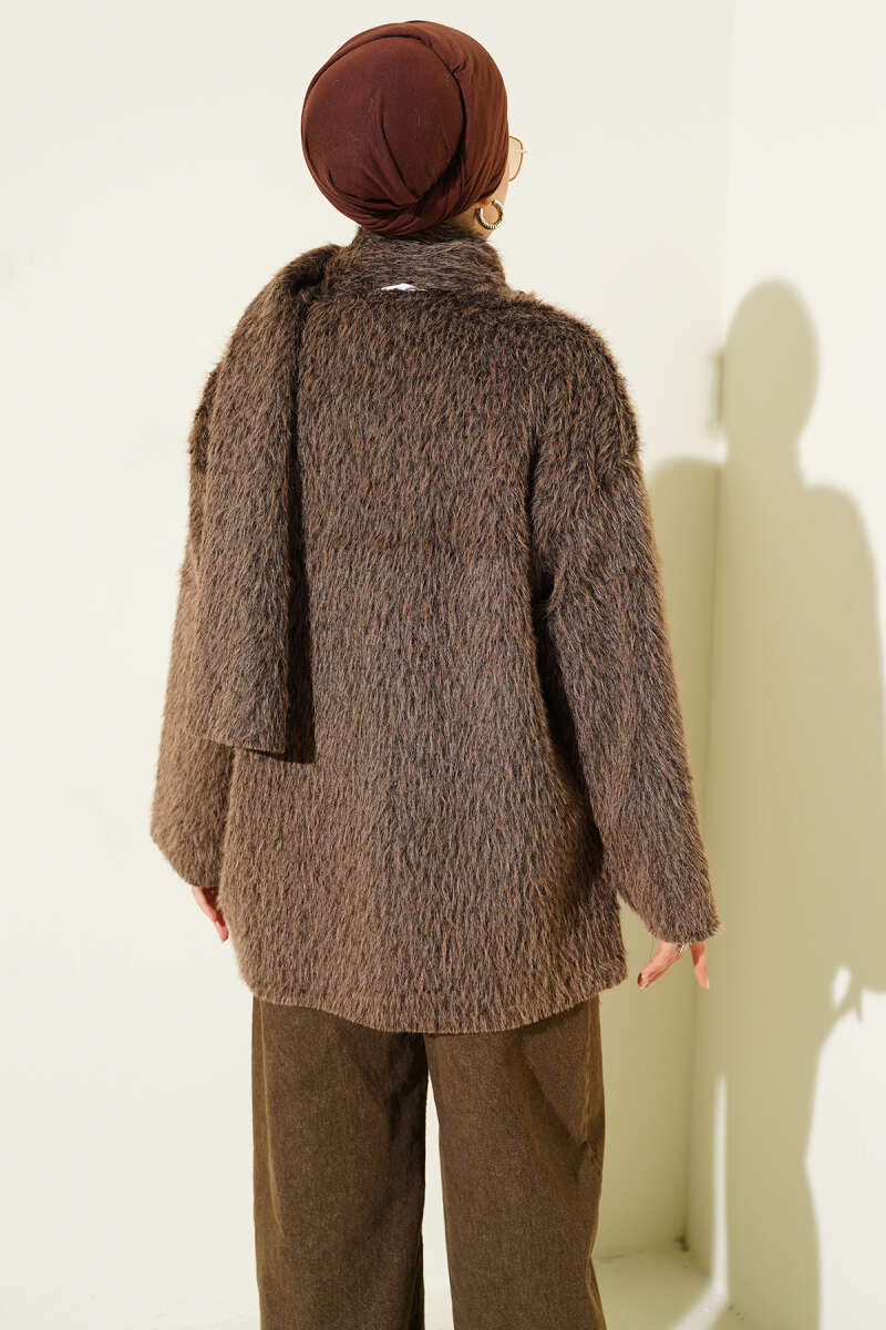 Fermuarlı Kuşaklı Keçe Ceket Taba