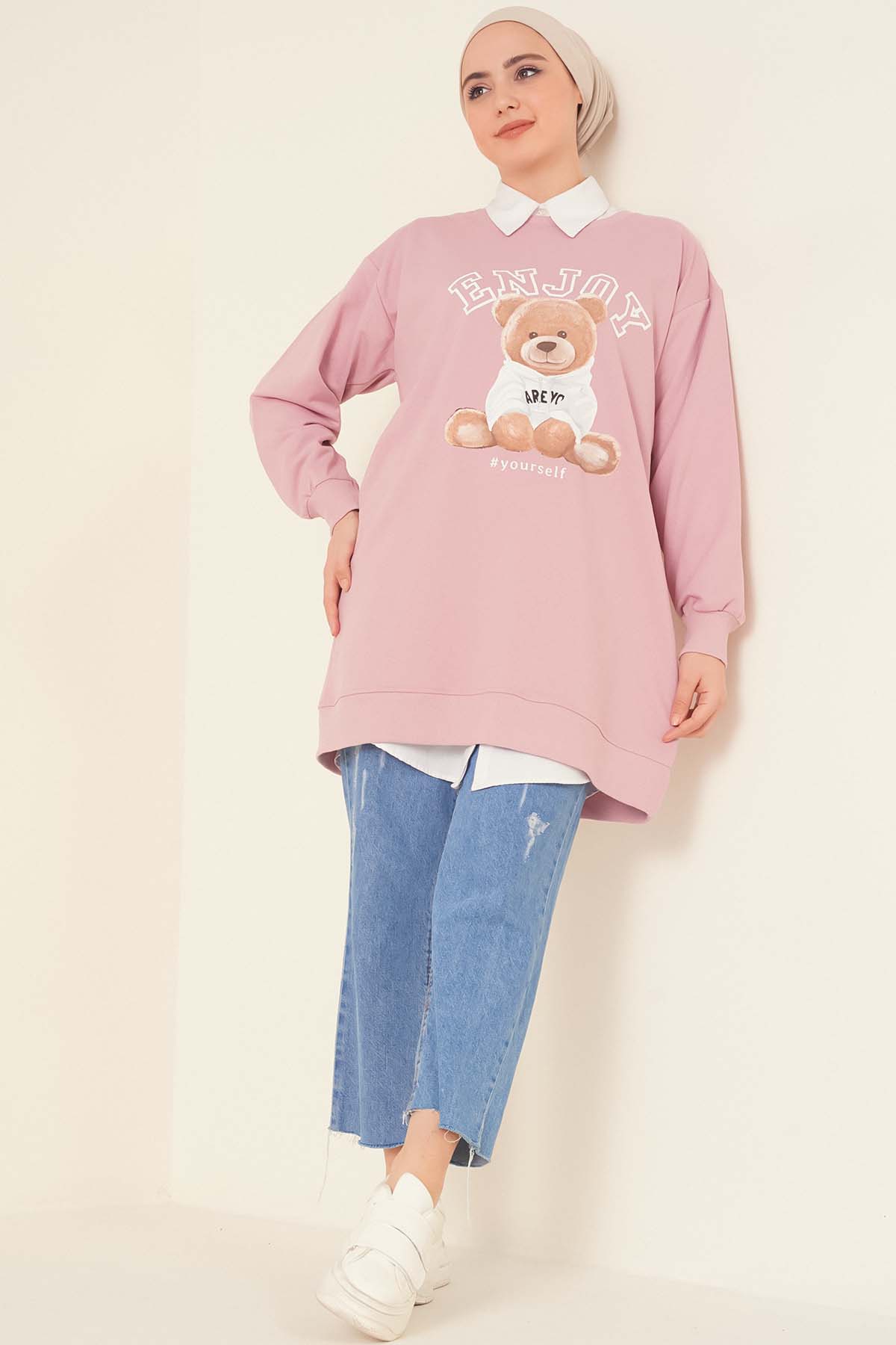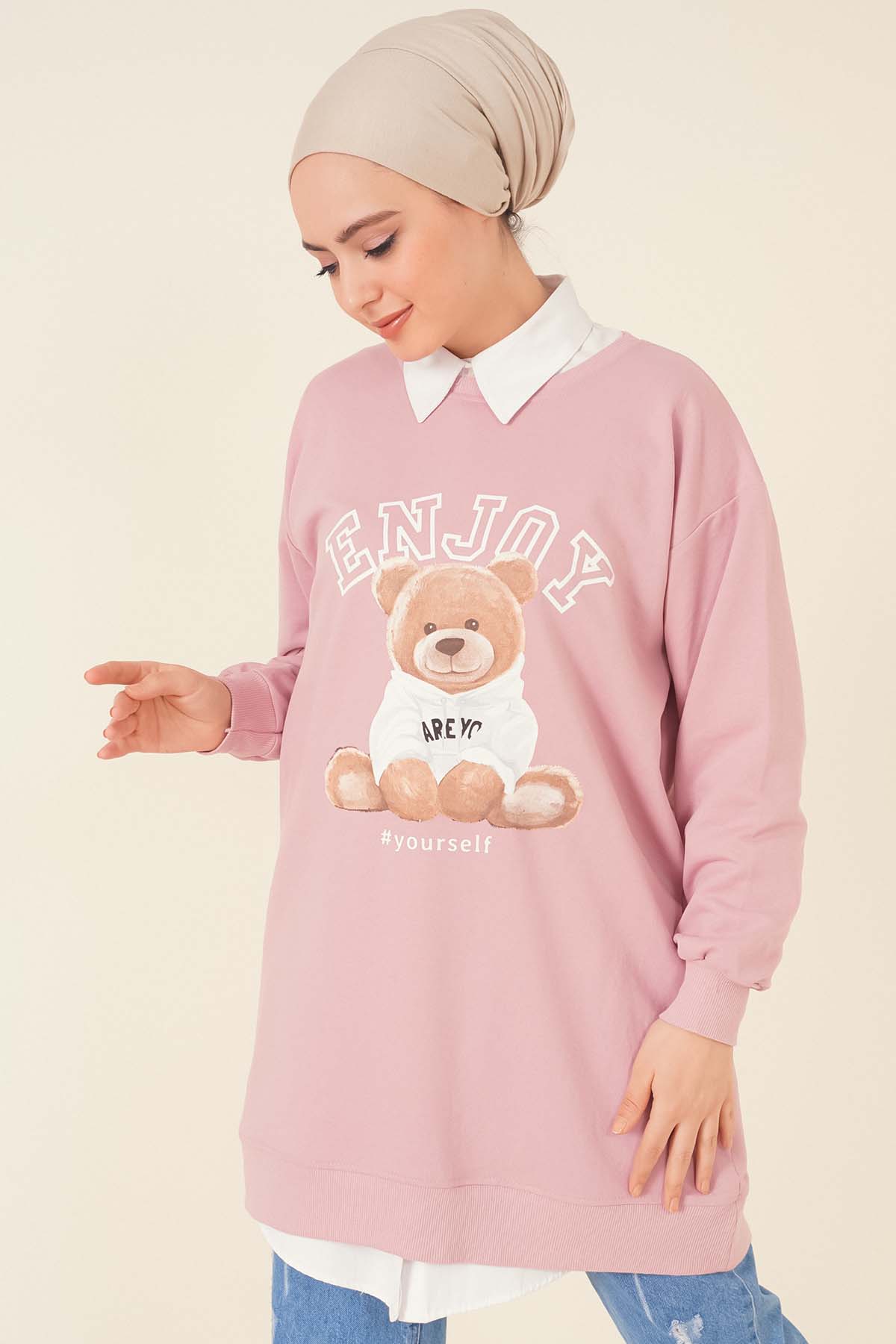 Yeni sezon model tuniğimiz harika tasarımıyla sizler için geldi. Önünde ayı baskısı ve enjoy yazısı bulunmaktadır. Hoş bir görünüme sahiptir. Her kıyafetinizle rahatlıkla kombinleyebilirsiniz. Farklı renk seçenekleri mevcuttur.