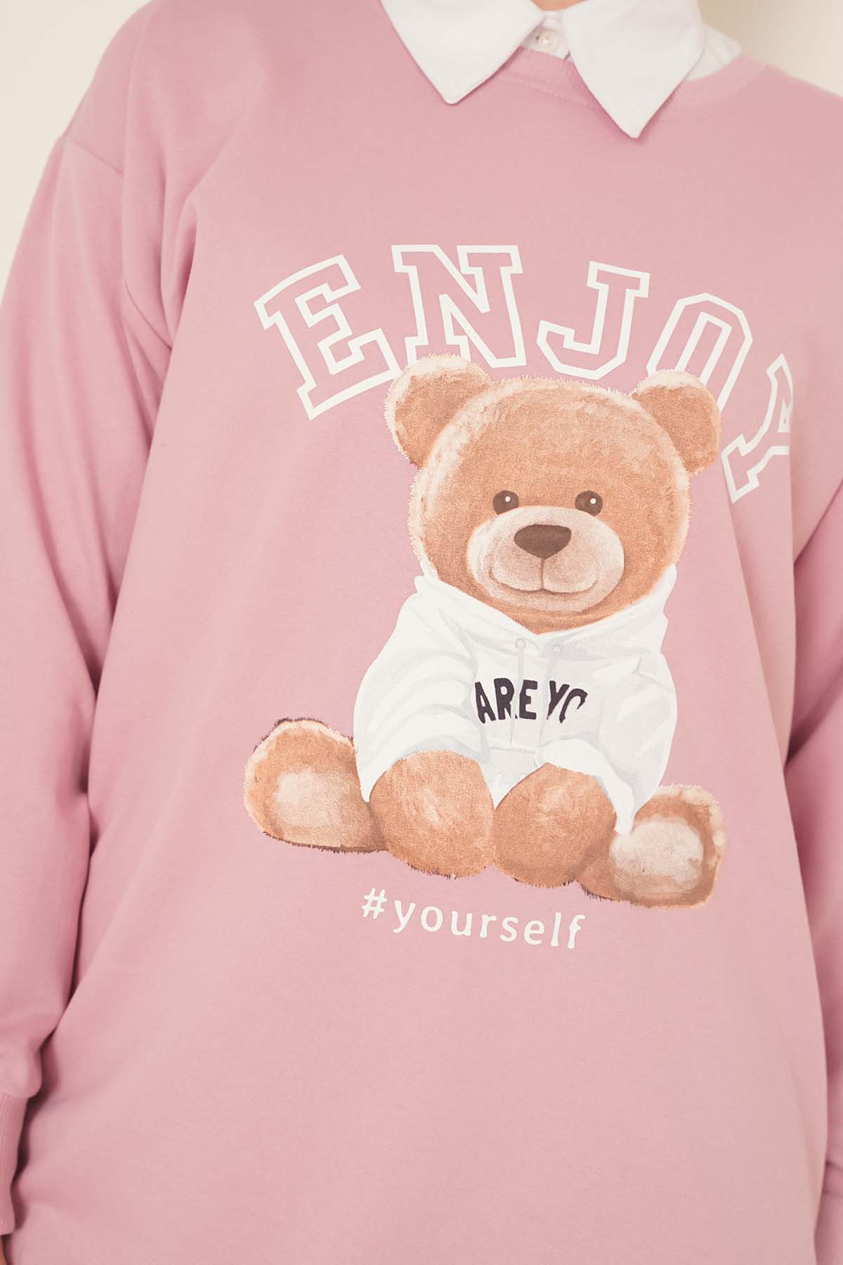Ürün BilgisiBoy: 85 cmGöğüs : 110 cmBel : 108 cmYeni sezon model tuniğimiz harika tasarımıyla sizler için geldi. Önünde ayı baskısı ve enjoy yazısı bulunmaktadır. Hoş bir görünüme sahiptir. Her kıyafetinizle rahatlıkla kombinleyebilirsiniz. Farklı renk seçenekleri mevcuttur.Ürün normal kalıptır.Kendi bedeninizi tercih edebilirsiniz.Kumaş Bilgisi%80 Cotton%20 PolyesterModel BilgisiBoy : 167 cmGöğüs : 80 cmBel : 60 cmKalça : 94 cmModelin üzerindeki ürün - M - bedendir.