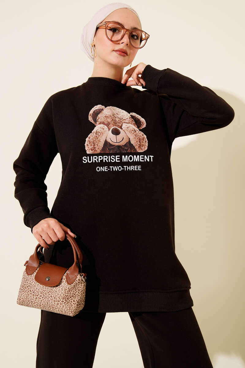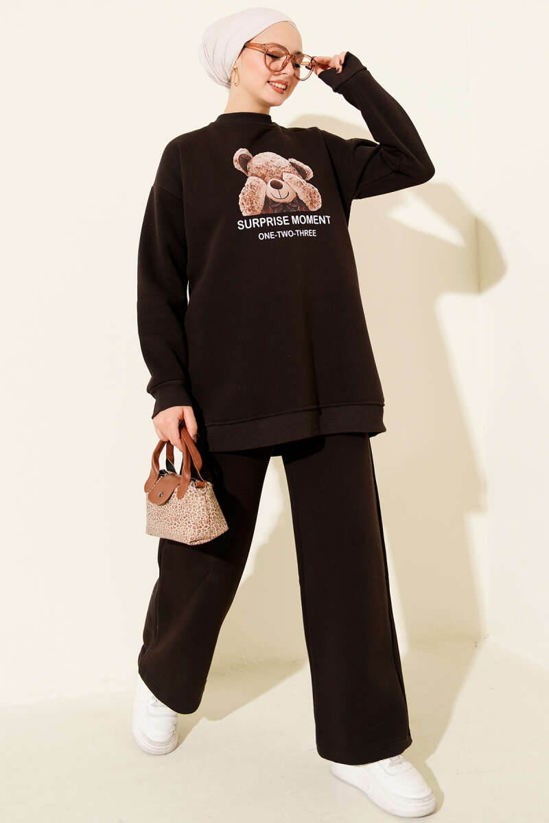 Ayıcık Baskılı Üç İplik İkili Takım Siyah