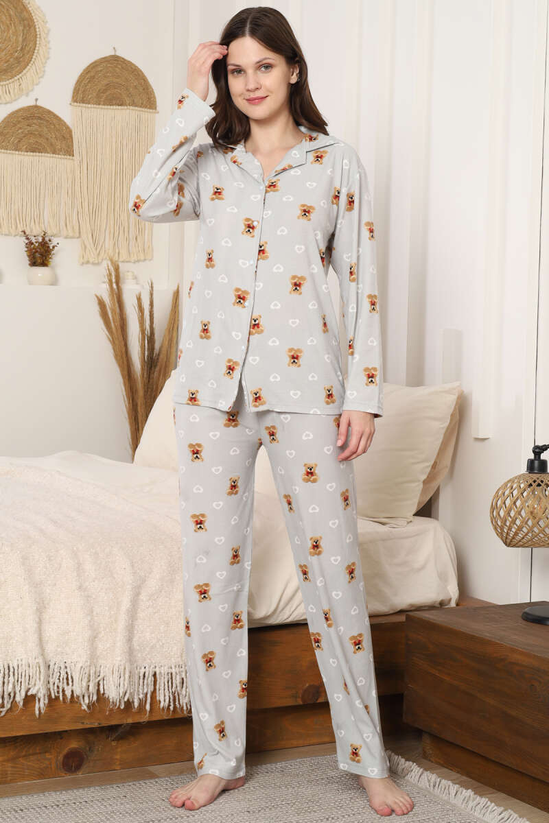 Ayıcık Desenli Düğmeli Süet Pijama Takımı Gri