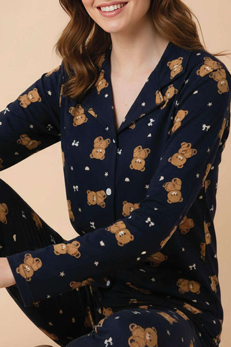 Ayıcık Desenli Önü Düğmeli Pijama Takımı Lacivert