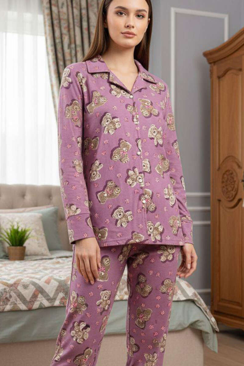 Ayıcık Desenli Süet Kruvaze Yaka Pijama Takımı Lila