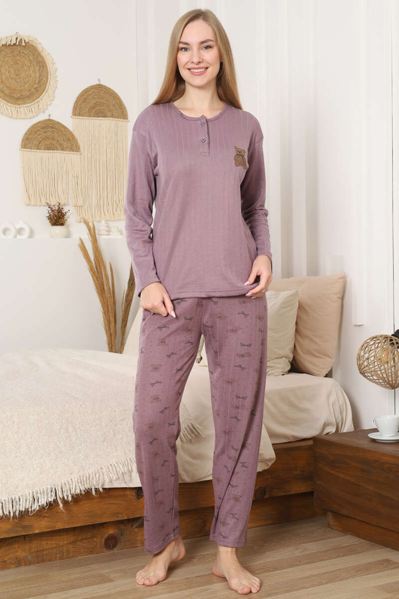 Ayıcık Nakışlı Fitilli Uzun Kol Pijama Takımı Gül Kurusu