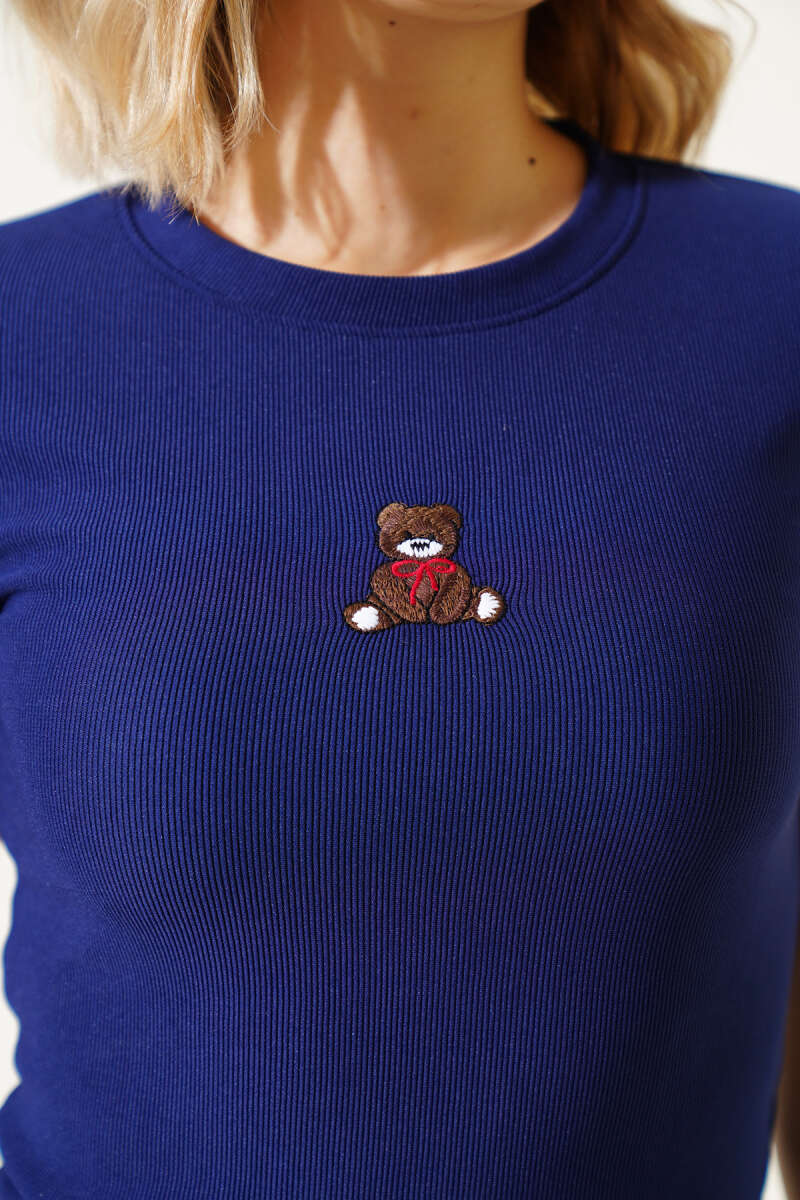 Ayıcık Nakışlı Kısa Kol Crop Lacivert