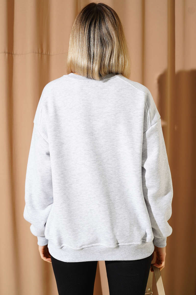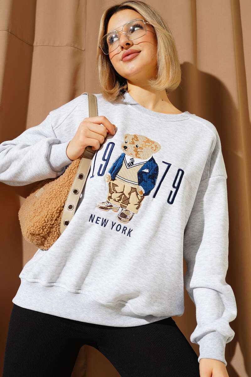 Ayıcık Nakışlı New York Üç İplik Sweatshirt Ekru