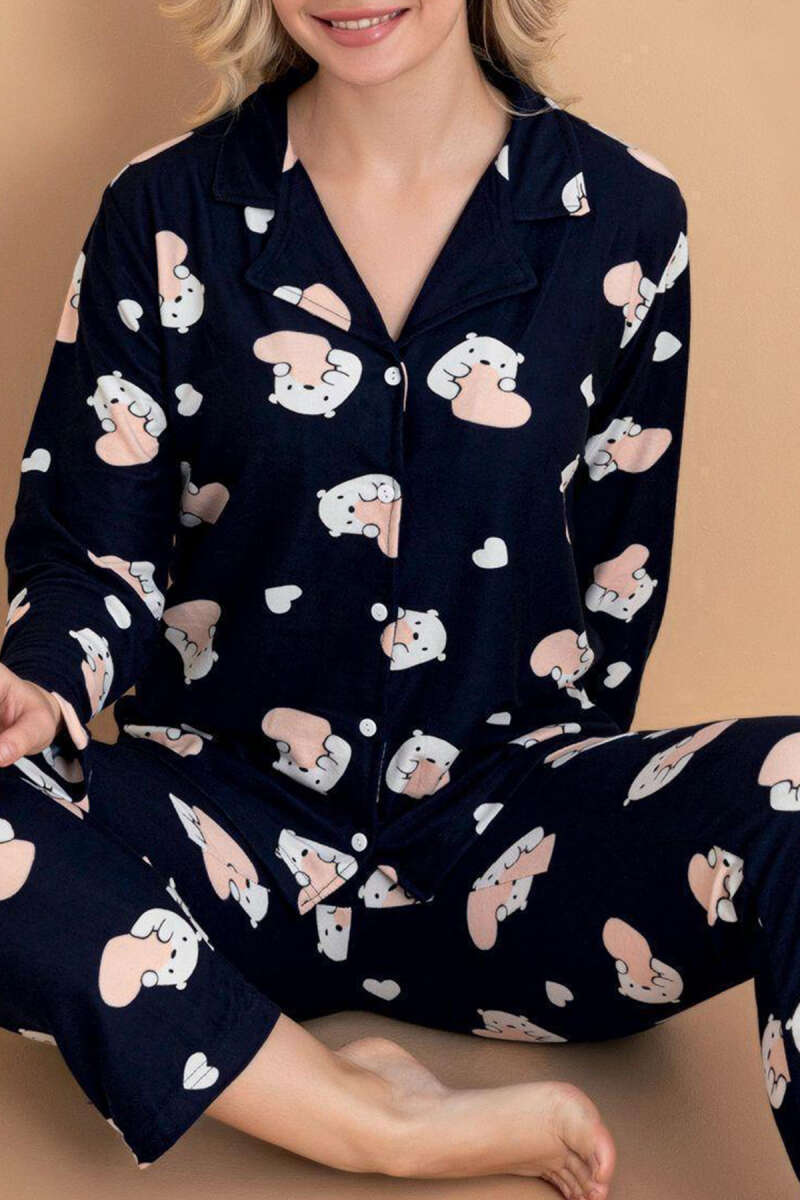 Ayıcıklı Kalpli Süet Pijama Takımı Lacivert