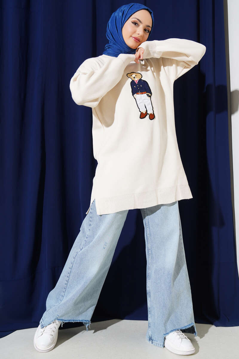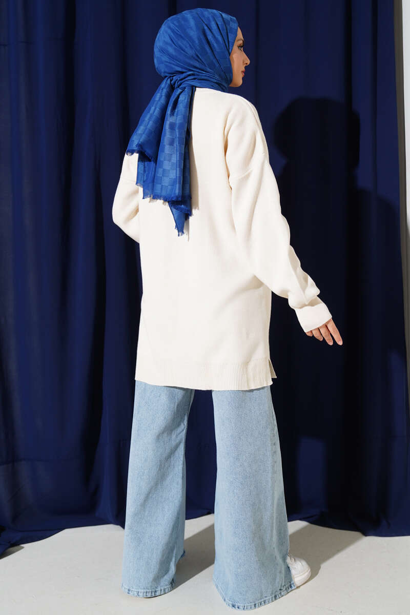 Çizgi Baklava Desen Triko Tunik Ekru
