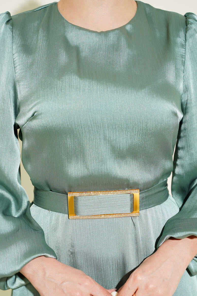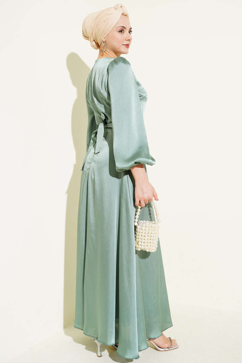 Ayna Kemerli Balon Kol Abiye Elbise Çağla Yeşili