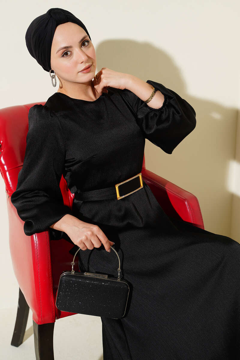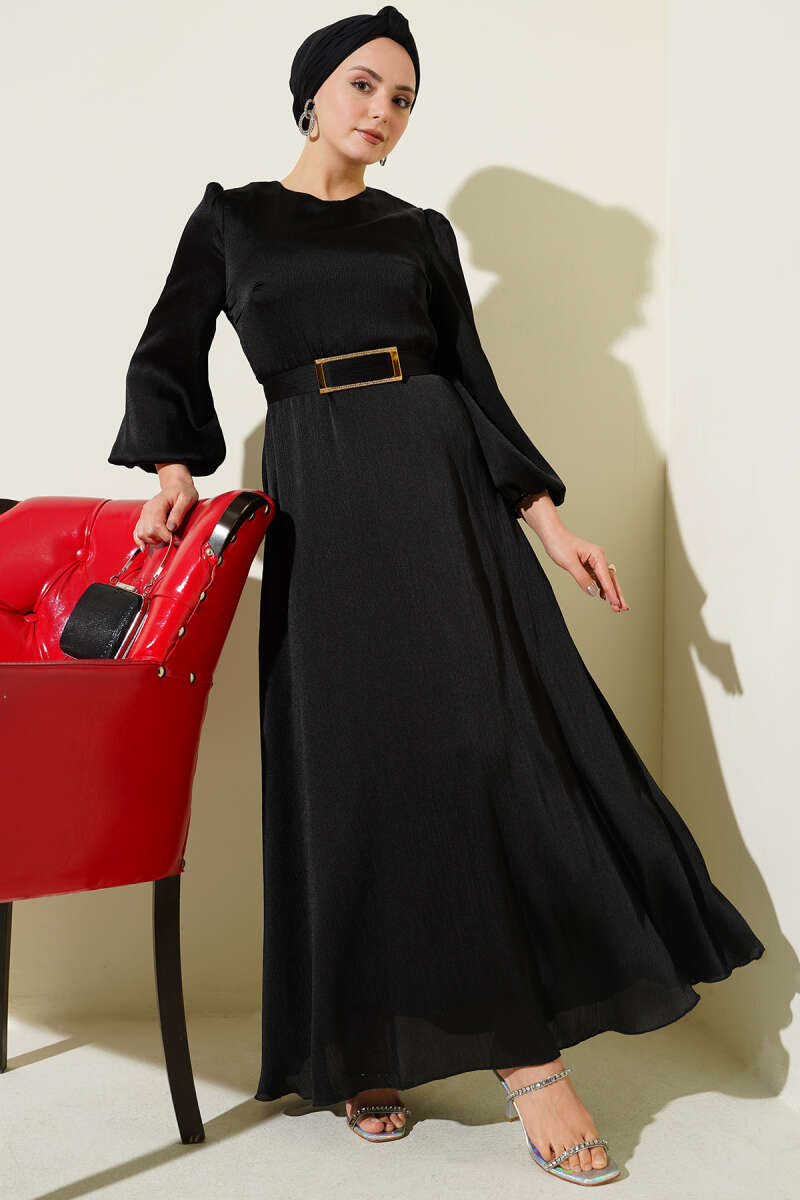 Ayna Kemerli Balon Kol Abiye Elbise Siyah
