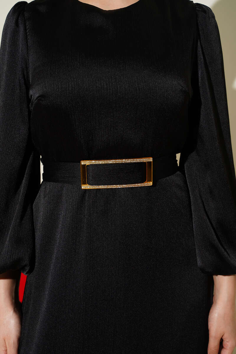 Gold Aksesuarlı Balon Kol Abiye Elbise Siyah