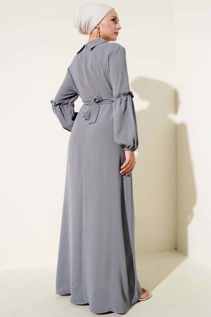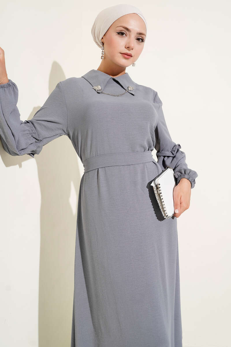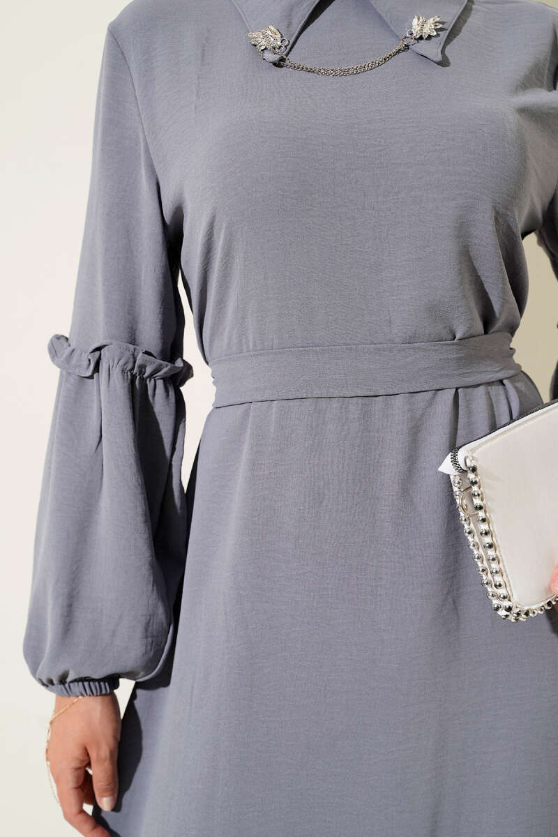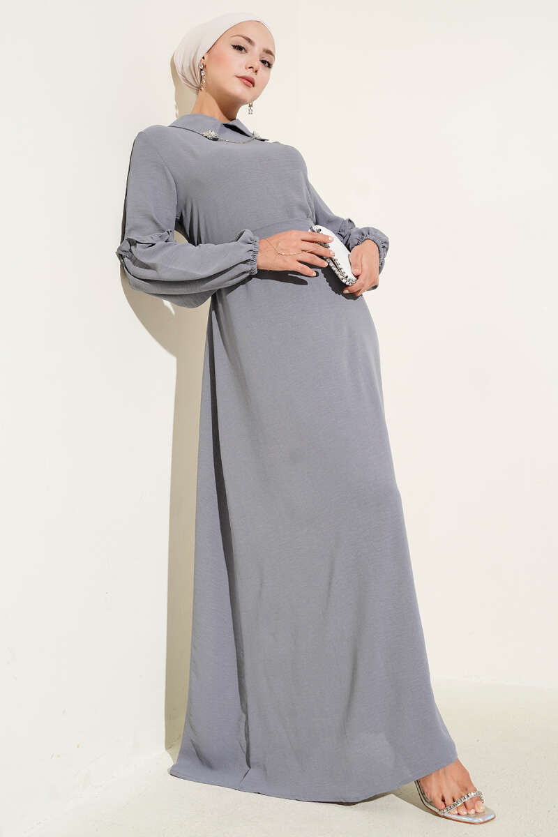 Desenli Gömlek Yaka Taş Düğmeli Elbise Duman Gri