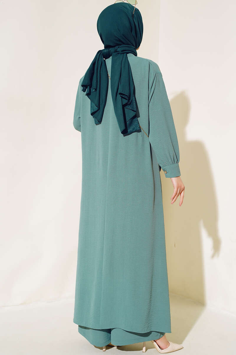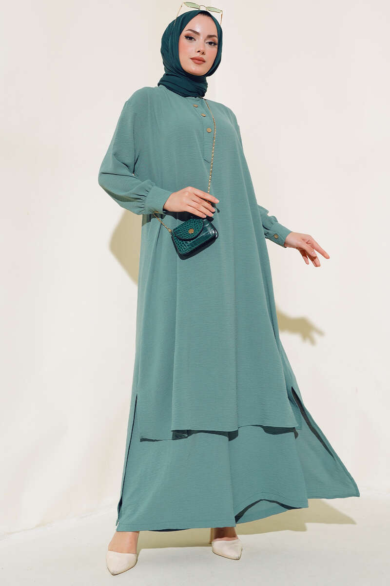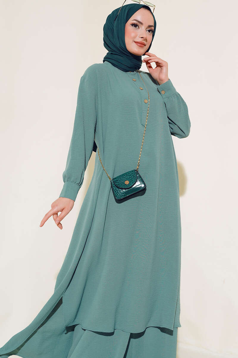 Yeni sezon ikili takım modelimiz sizlerle beraber. Tuniğimiz salaş modeldir. Yakası dört adet tahta düğmelidir. Kol bilekleri düğmelidir. Uzun boy tunik modelimizin etek ucu yanlardan yırtmaçlıdır. Önü kısa arkası uzun modeldir. Pantolonumuzun beli lastiklidir. Geniş paça modeldir. Geniş ikili takım modelimizin renk seçenekleri mevcuttur.