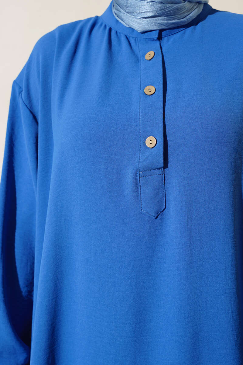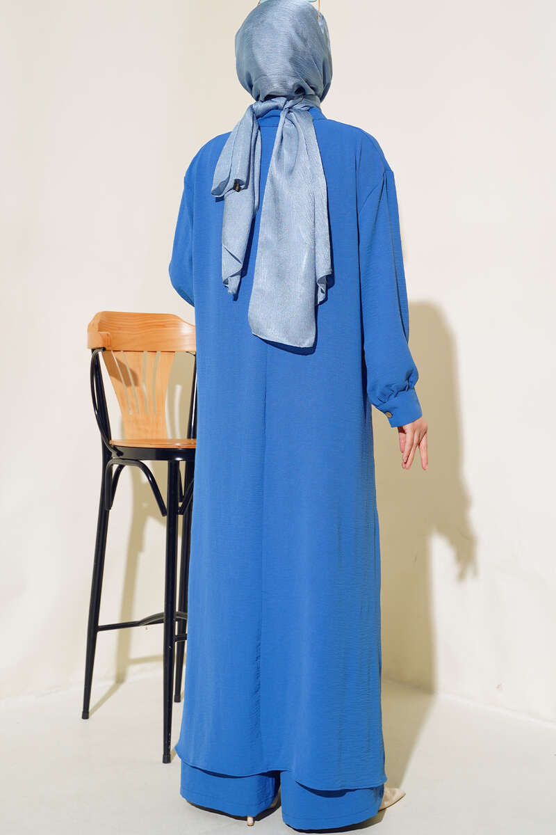Yeni sezon ikili takım modelimiz sizlerle beraber. Tuniğimiz salaş modeldir. Yakası dört adet tahta düğmelidir. Kol bilekleri düğmelidir. Uzun boy tunik modelimizin etek ucu yanlardan yırtmaçlıdır. Önü kısa arkası uzun modeldir. Pantolonumuzun beli lastiklidir. Geniş paça modeldir. Geniş ikili takım modelimizin renk seçenekleri mevcuttur.