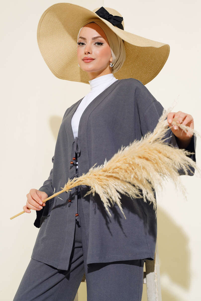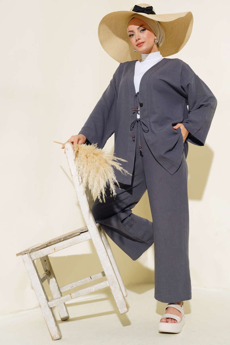 Yeni sezon ikili takımımız favorileriniz arasında girecektir. Kimonomuzun önü bağcık detaylıdır. Salaş modeldir. Düşük omuzludur. Pantolonumuzun belinin arkası lastiklidir. Geniş paçalıdır. Cepsiz modeldir. Hem şık hem sportif olan ikili takımım yaz ve bahar aylarınızın vazgeçilmezi olacaktır.