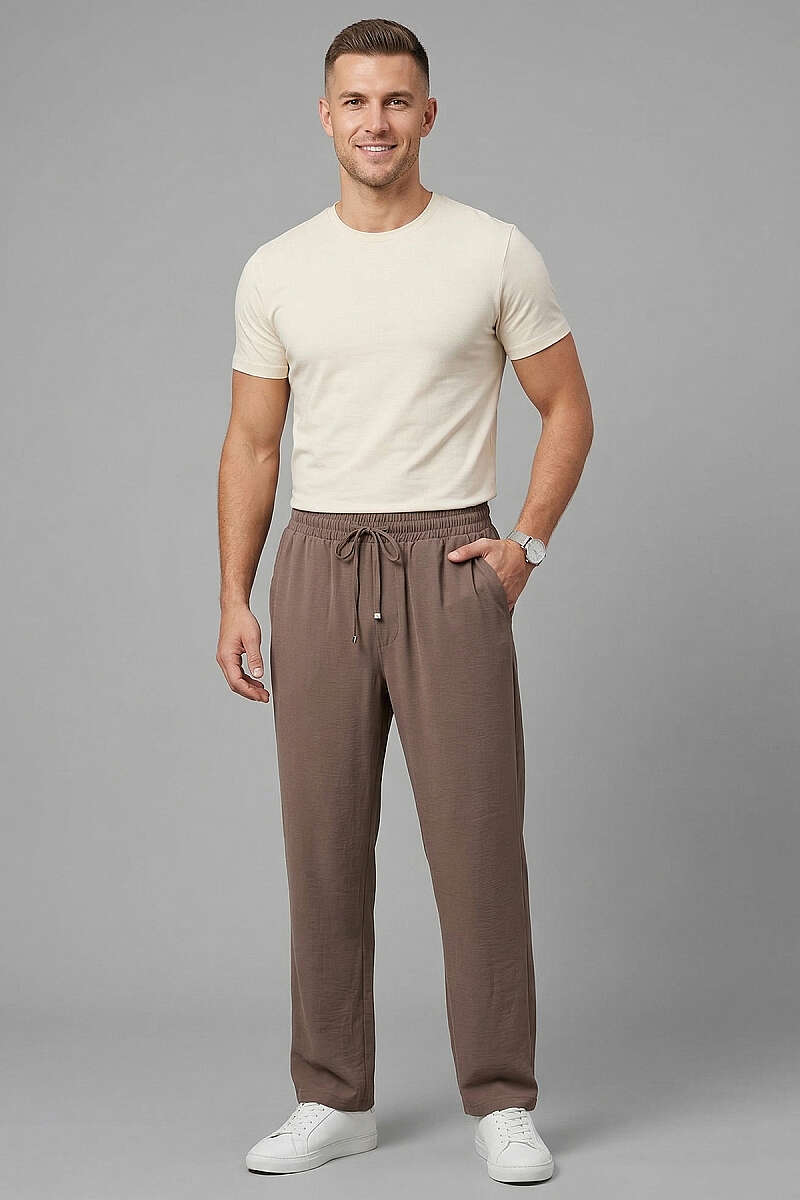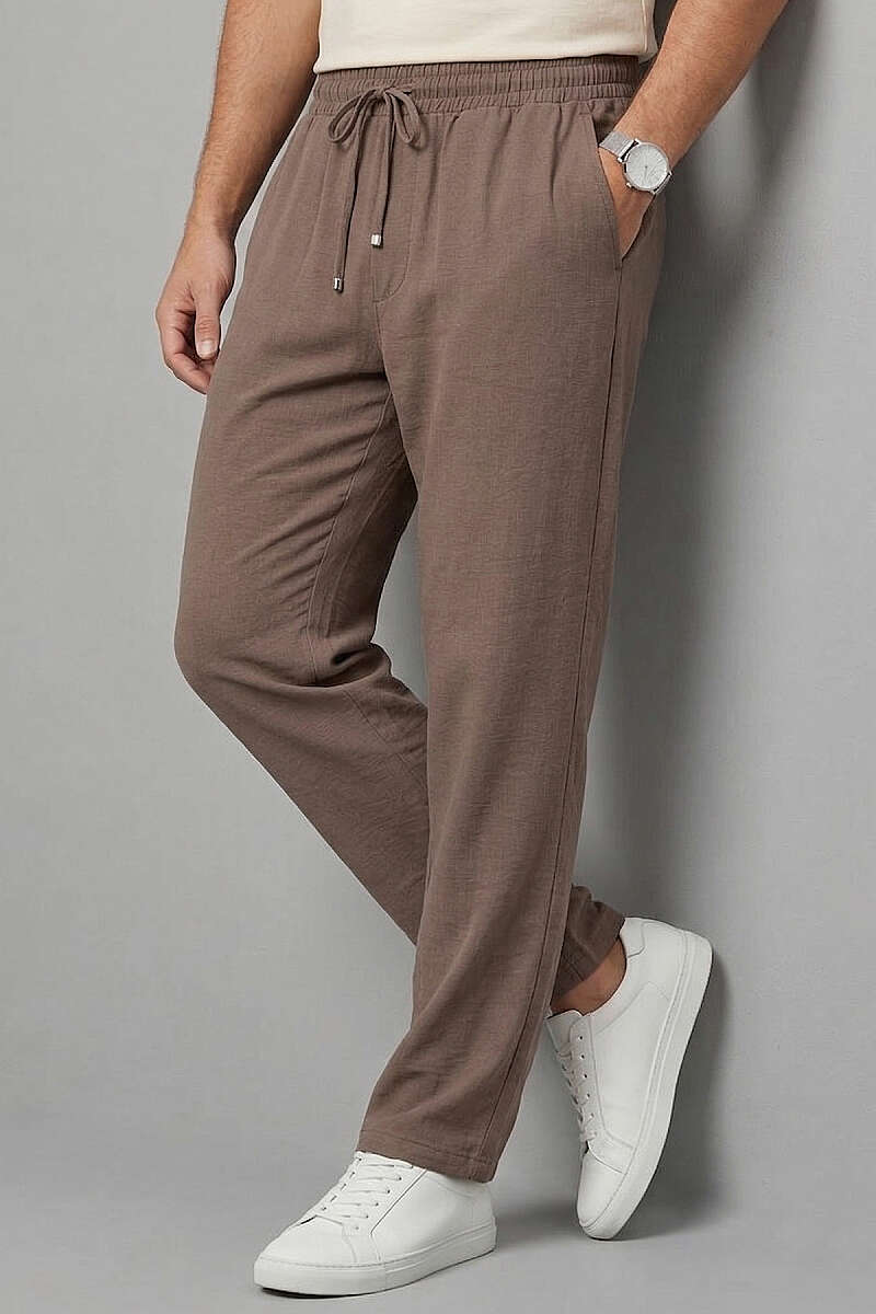 Hasır Kemerli Keten Erkek Pantolon Kahve