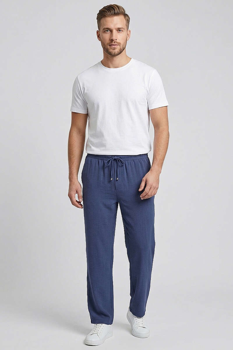 Hasır Kemerli Keten Erkek Pantolon Beyaz