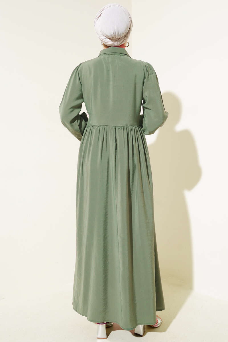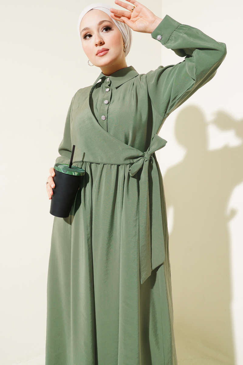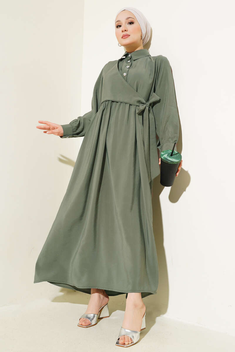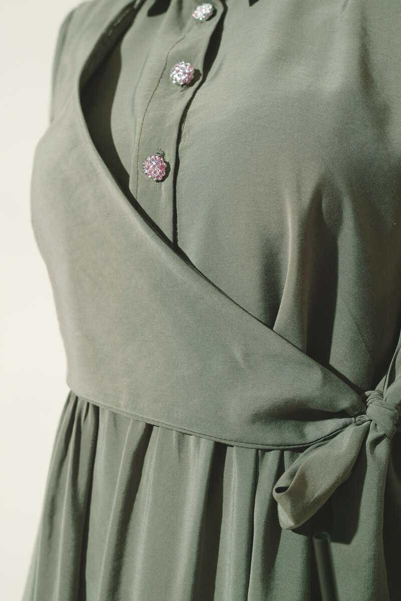 Düğmeli Tensel İnce Kemerli Elbise Kahve