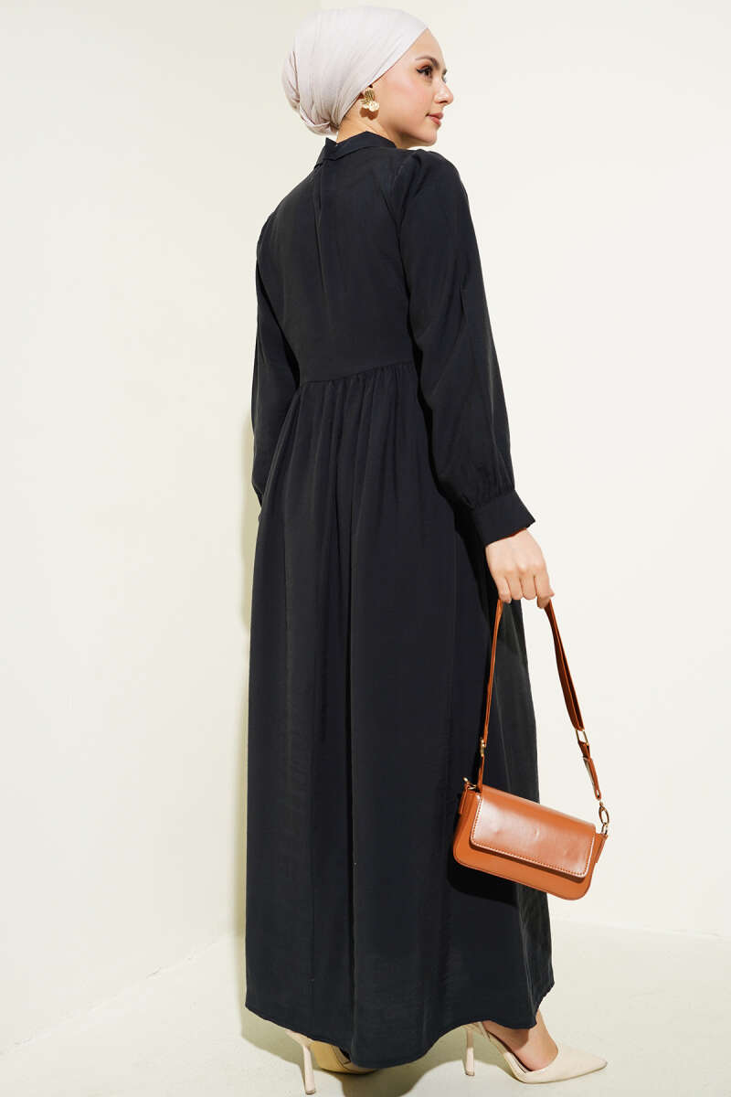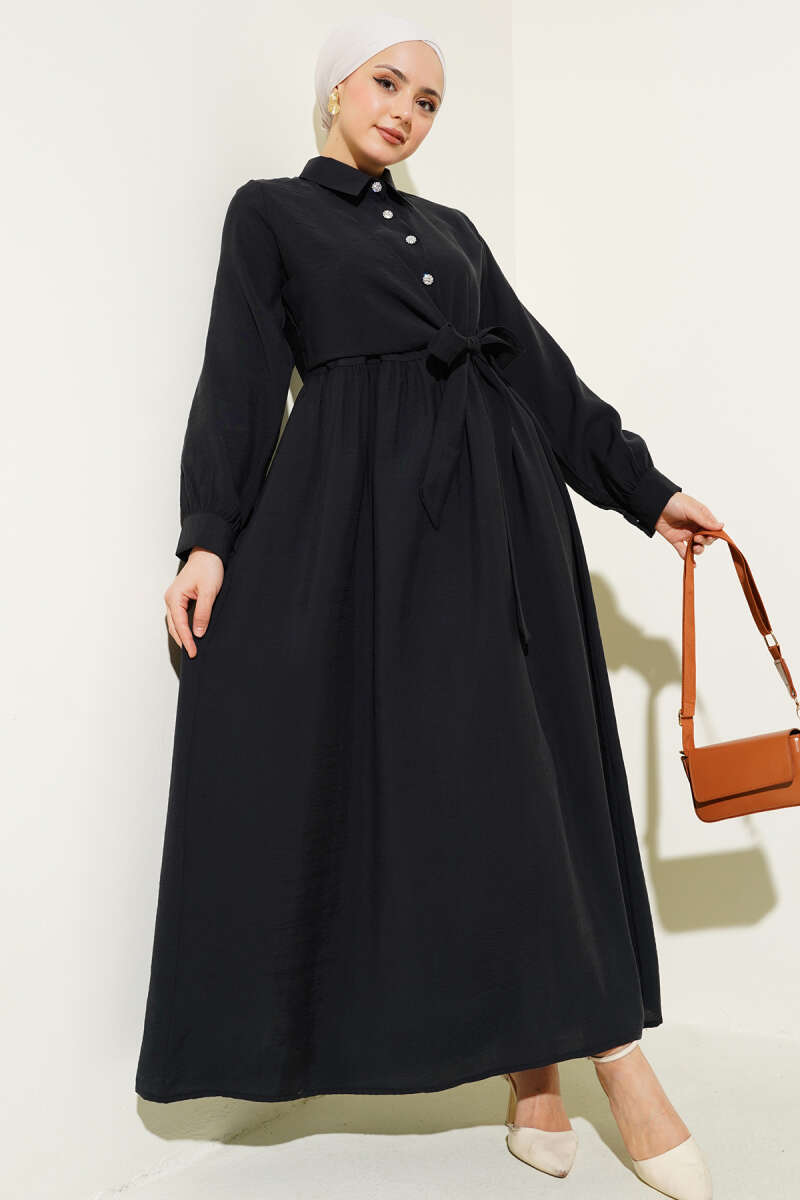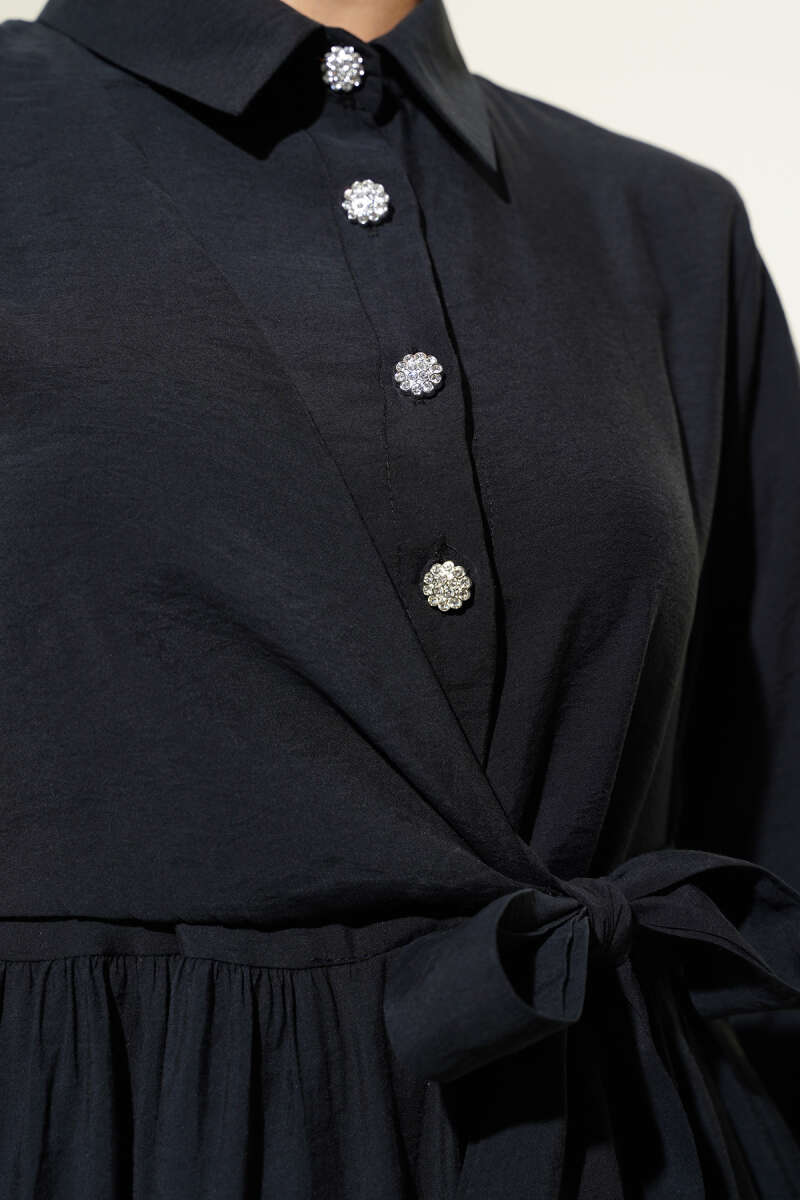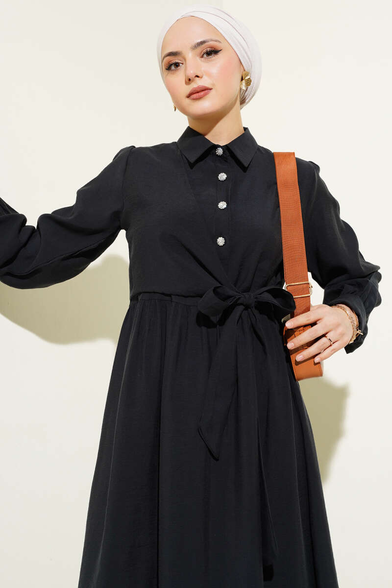 Düğmeli Tensel İnce Kemerli Elbise Siyah