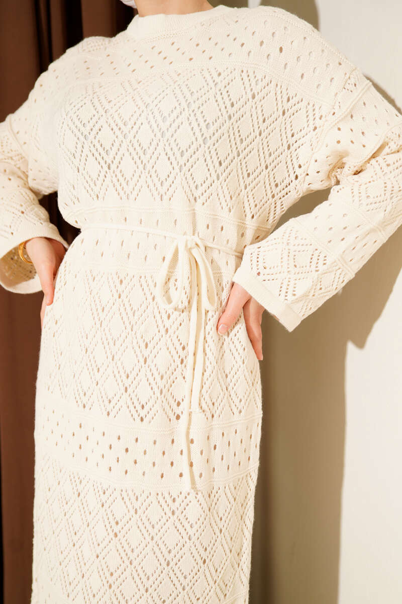 Baklava Desen Ajurlu Triko Elbise Vizon